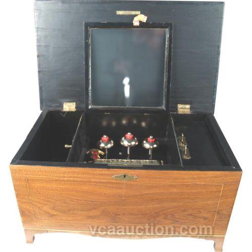 Lever-Wind 6" Cylinder Music Box With 3 Bells, 8 Airs, Plain 19" X 12" X 10" Case, Restored Works, Needs Some Damper Work, Unknown Manufacturer.