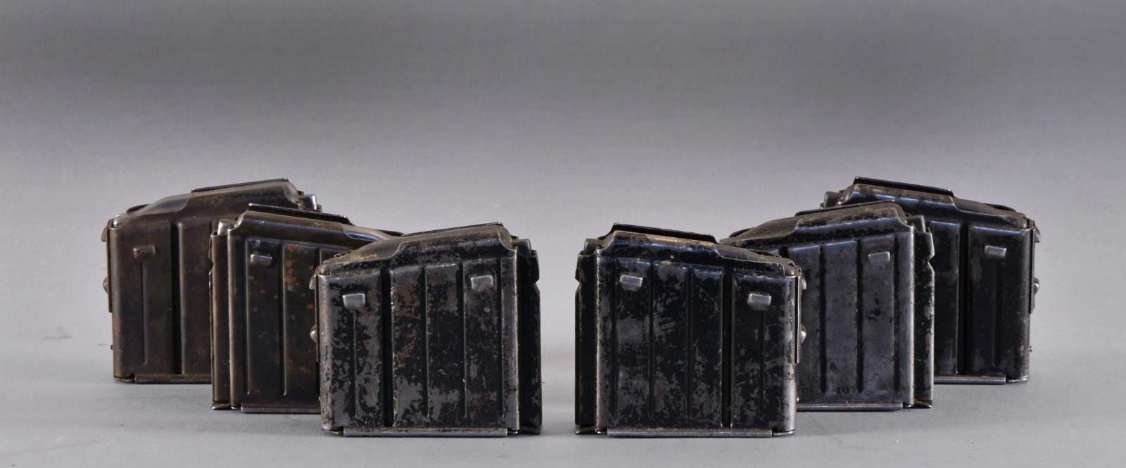 For 8mm Mauser painted black w/ a 10 rd. capacity. Markings appear identical on all 6 mags., though some are easier to read than others. The factory code is “gcb”. All are stamped w/ waffenamts consisting of the German eagle as well as “WaA892” & “K43”. Black paint is mostly faded & worn, but followers appear to move freely. (02-13776-30/JZ). NONGUN. $600-1,200.