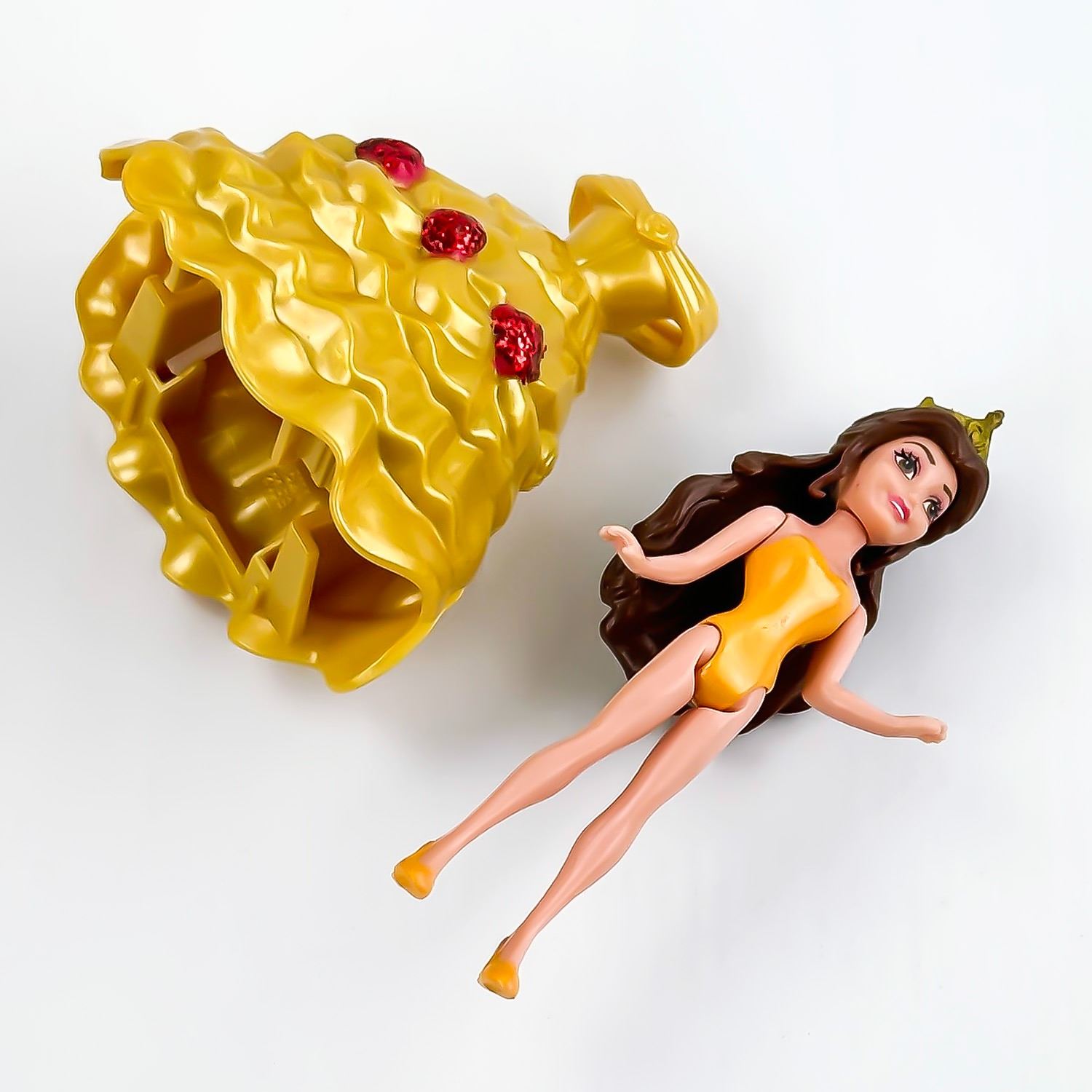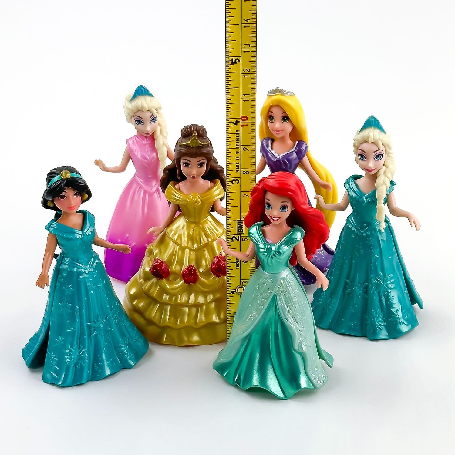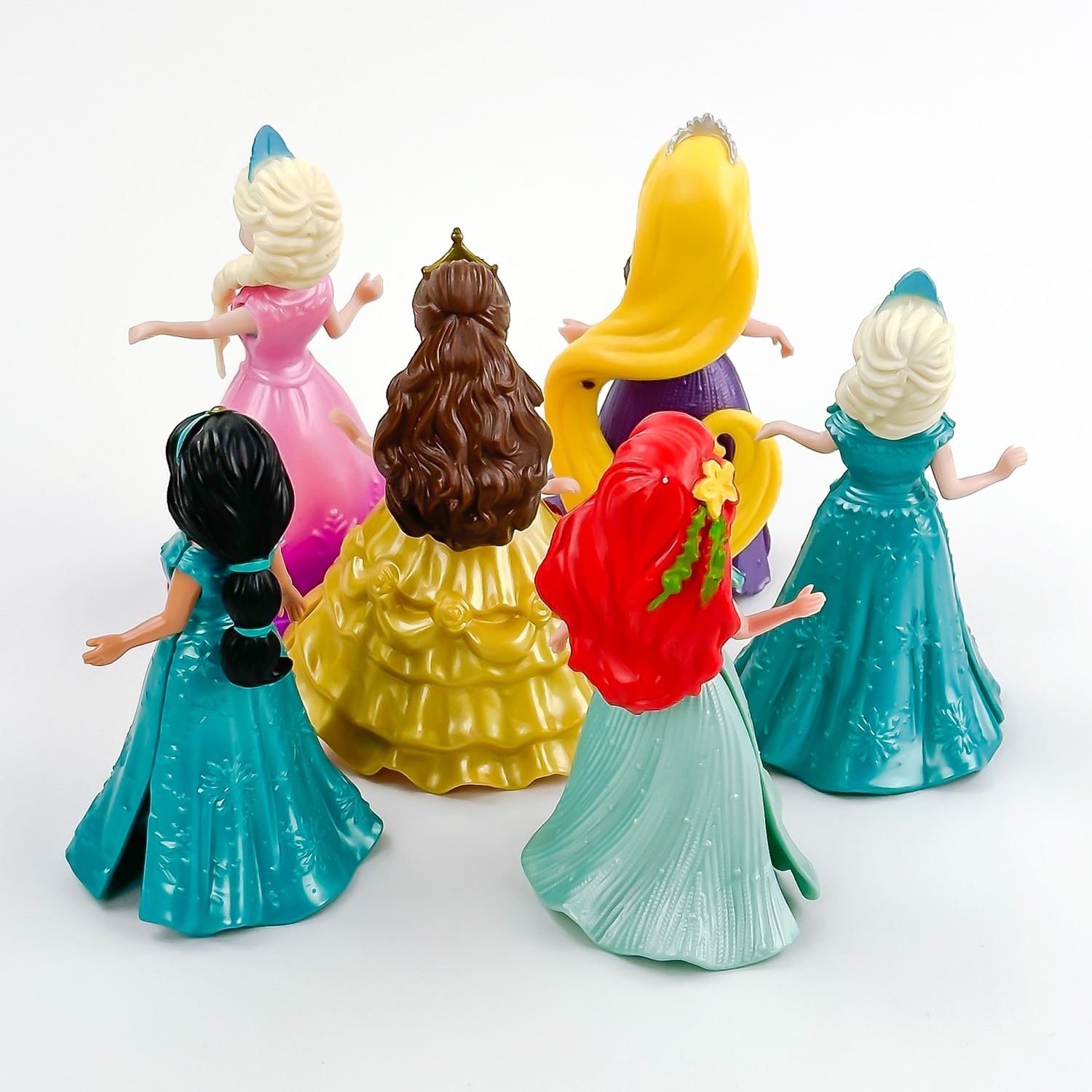 #9415 - 6 DISNEY PRINCESS POLLY POCKET MAGICLIP MAGIC CLIP TOY DOLL FIGURES & DRESSES / GOWNS. THERE IS PRINCESS JASMINE, 2X PRINCESS ELSA, PRINCESS BELLE, PRINCESS ARIEL AND PRINCESS RAPUNZEL - WITH INTERCHANGEABLE GOWNS. CARTOON ANIMATION PRINCESS CHARACTER TOYS. THEY MEASURE ROUGHLY 3.75” (9.5 CM) TALL
