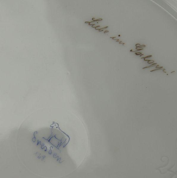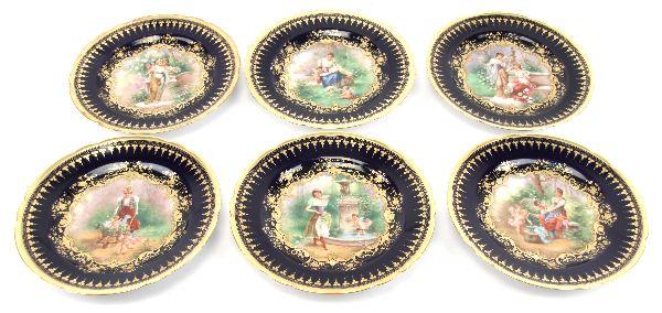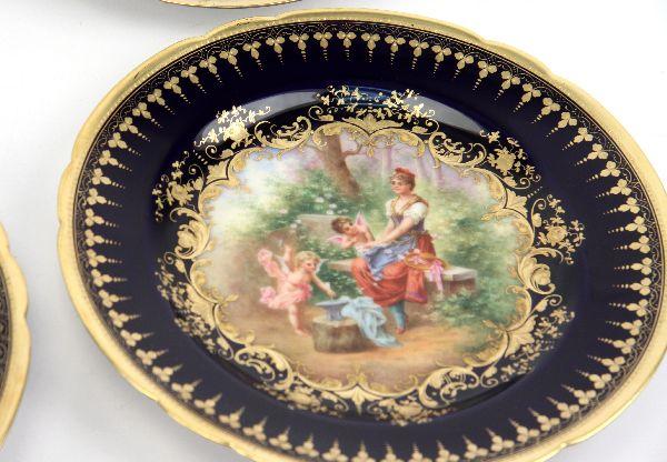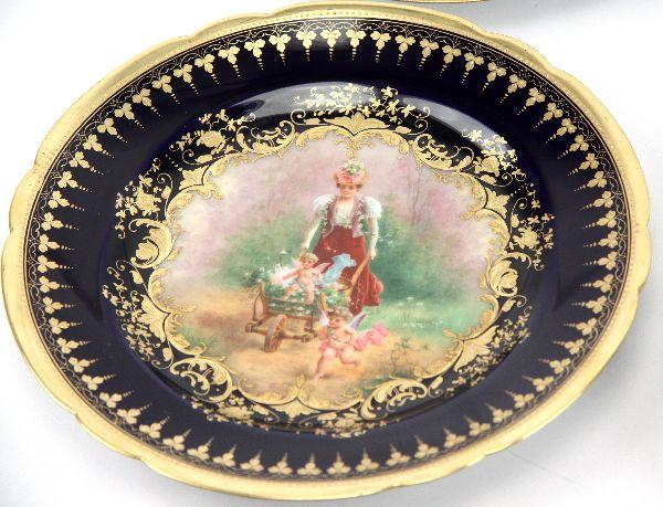 9.5 inch cabinet plates, each hand painted with Ladies in gardens keeping company with putti (or cherubs). Each is very well executed and two are signed (Fredrich and Franke). All having heavy hand gilt work also. Verso carries the Dresden mark (blue unde