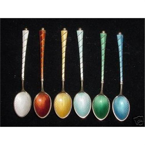 6 Danish Russian Style Enamel on Sterling Silver Demi-tasse Spoons. Maker's name appears to be Ela. The light blue spoon has one diagonal section missing enamel o/w excellent condition. Shipping cost will be the USPS estimate + insurance to be sent in invoice after purchase is made.