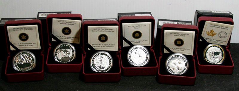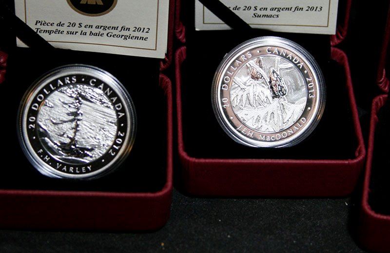 6 Canadian Royal Canadian Mint Group of 7 $20 Fine Silver Coins -- Tom Thompson (Spring Ice), Franz Johnston (Guardian of the Gorge), Franklin Carmichael (Houses, Cobalt), J.E.H. MacDonald (Sumacs), F.H. Varley (Stormy Weather, Georgian Bay) & A.Y. Jackson (Saint-Tite-des-Caps)