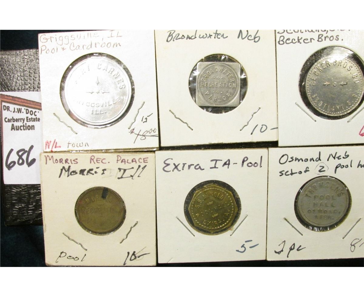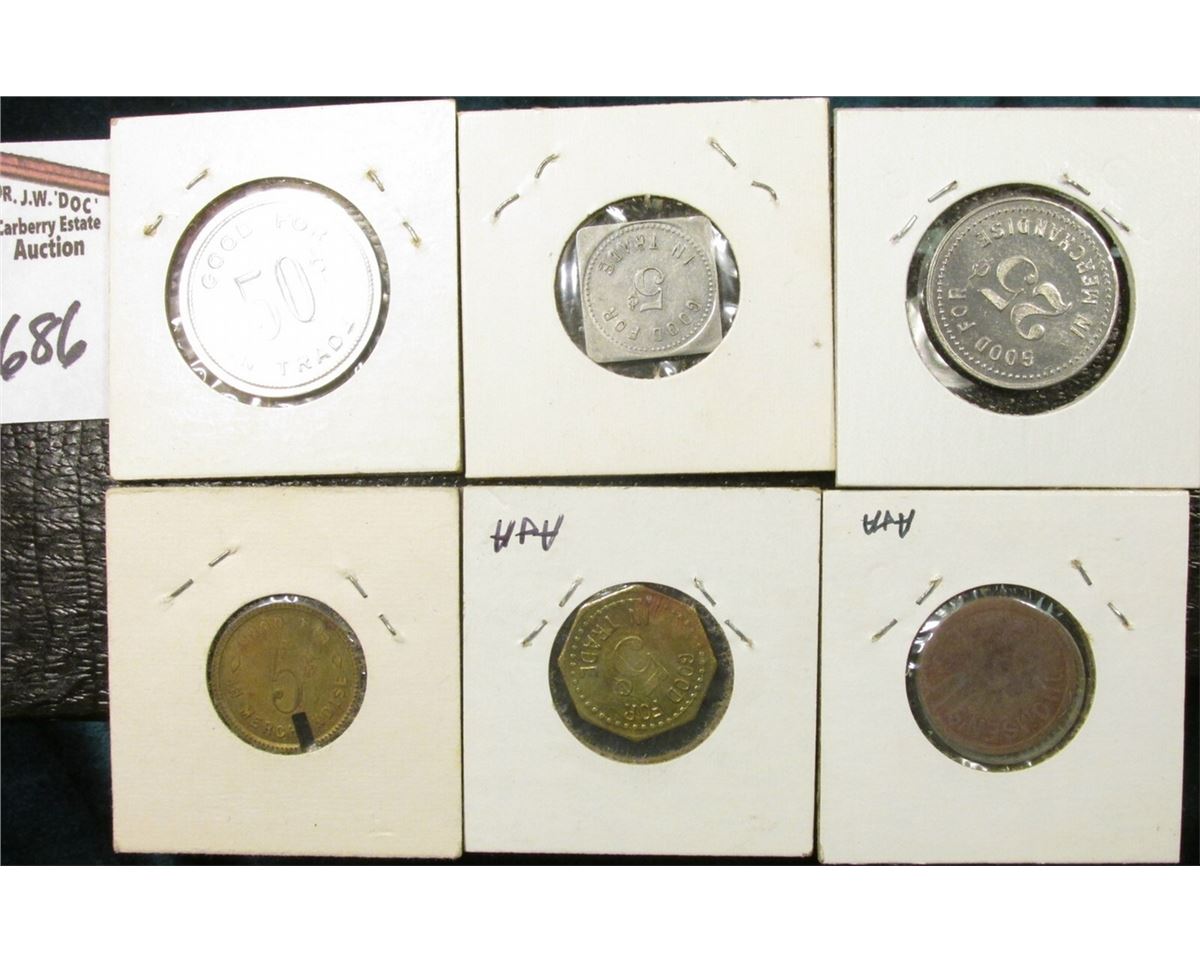 (6) Different Good For Tokens including: "Morris, Ill.", "Exira, Ia.", "Osmond, Ne.", "Griggsville, Ill.", "Broadwater, Ne.", & "Scotland, S.D." 'Doc' valued this group at over $50.00.