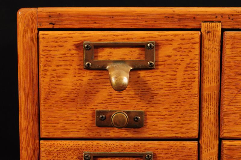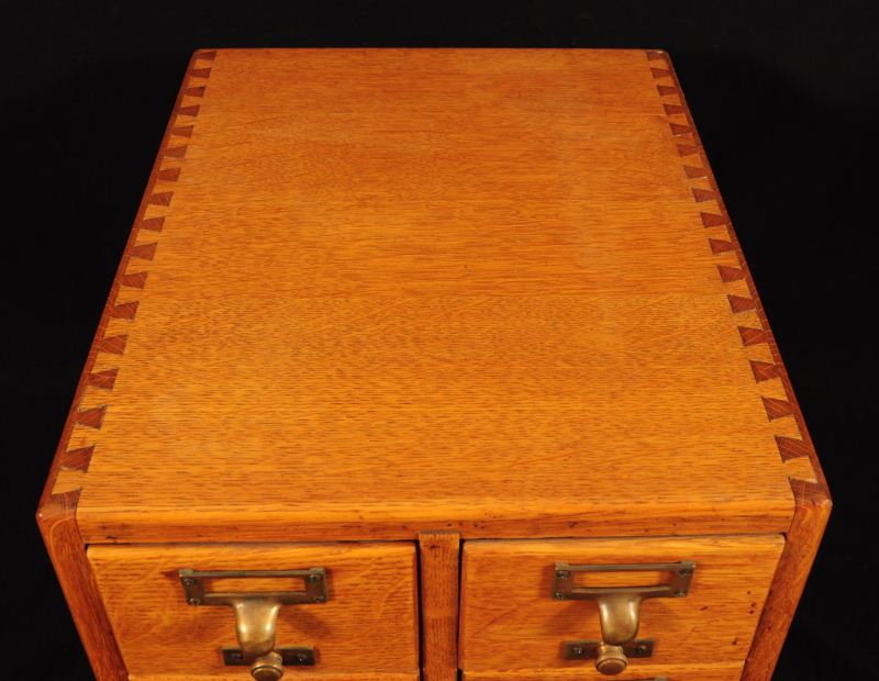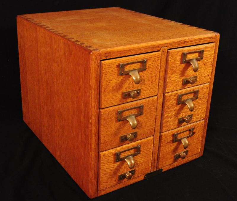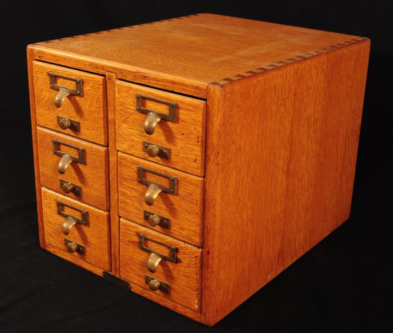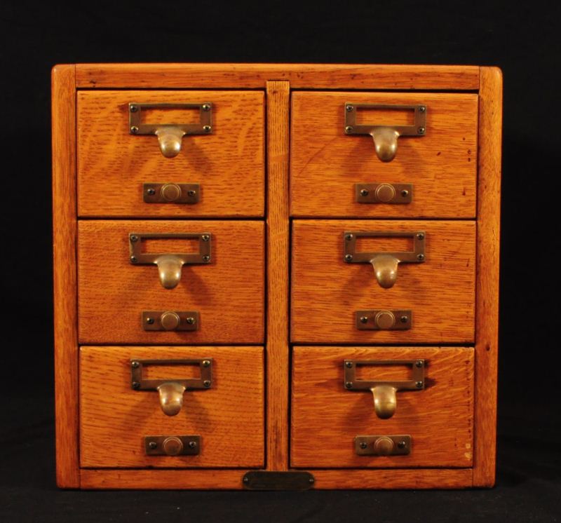 6 Drawer Oak Countertop Card Cabinet. Measures 13 3/4" wide x 17" deep x 13 1/4" tall.