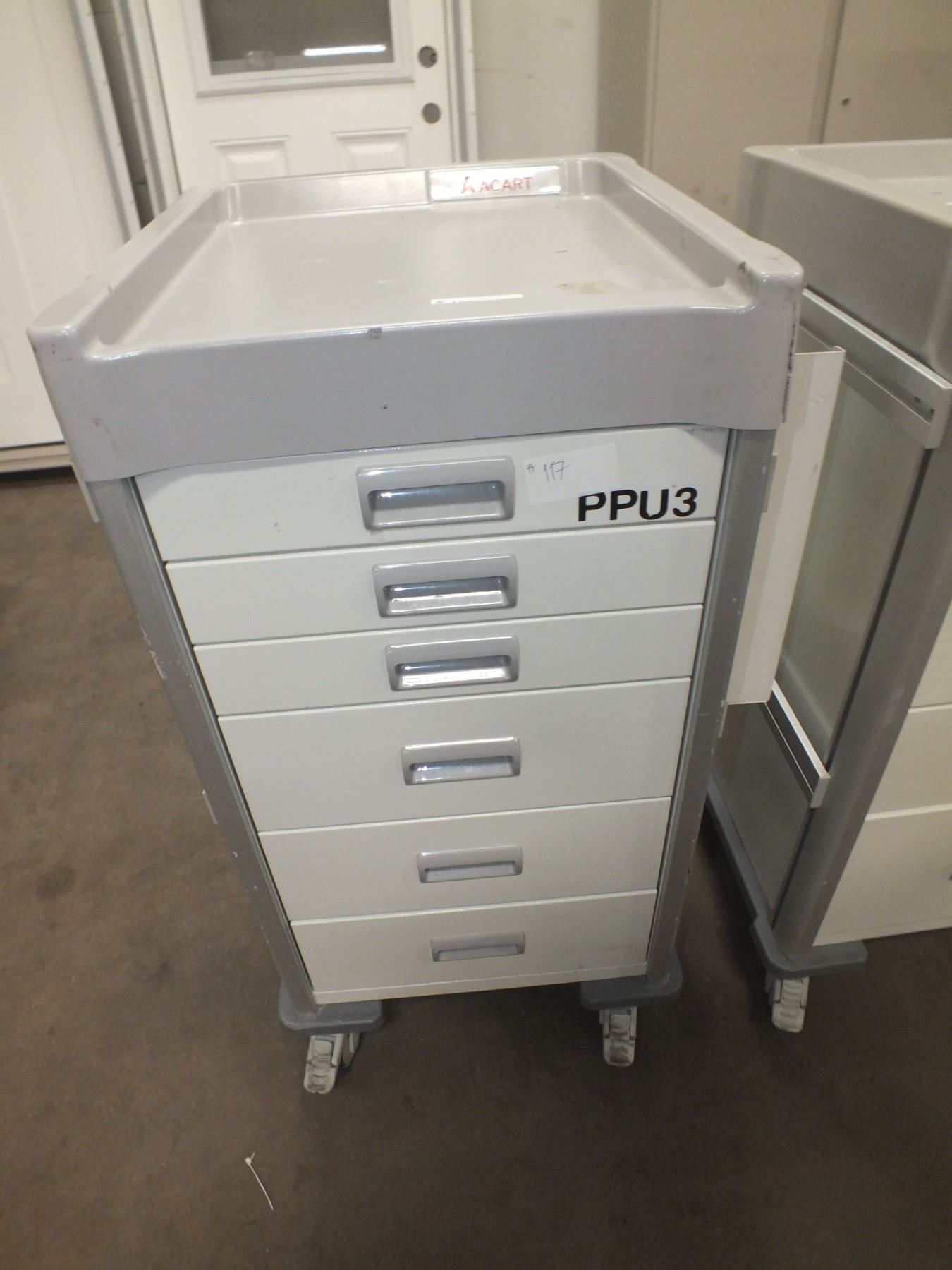 6 Drawer Storage cart On wheels, some minor damage as seen in the photos, 18"x 19 1/2" x 39"h...used