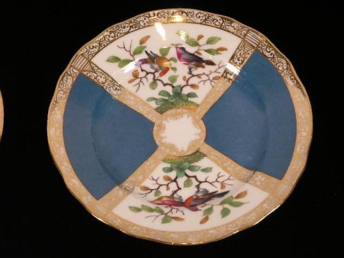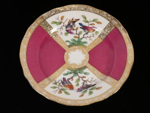 (19th Century German) Porcelain with six different glazed and bird motif, mark verso "(crown monogram) RK Dresden Germany) gilt edges, very good condition, dia. 6 1/8" each.