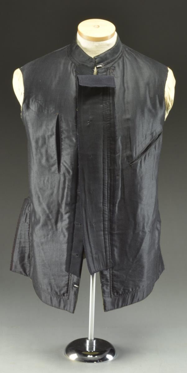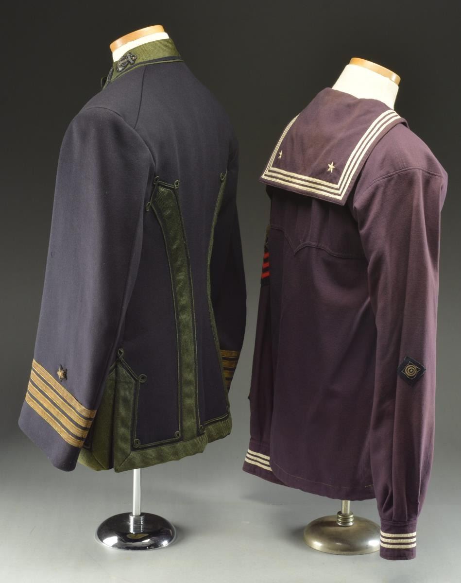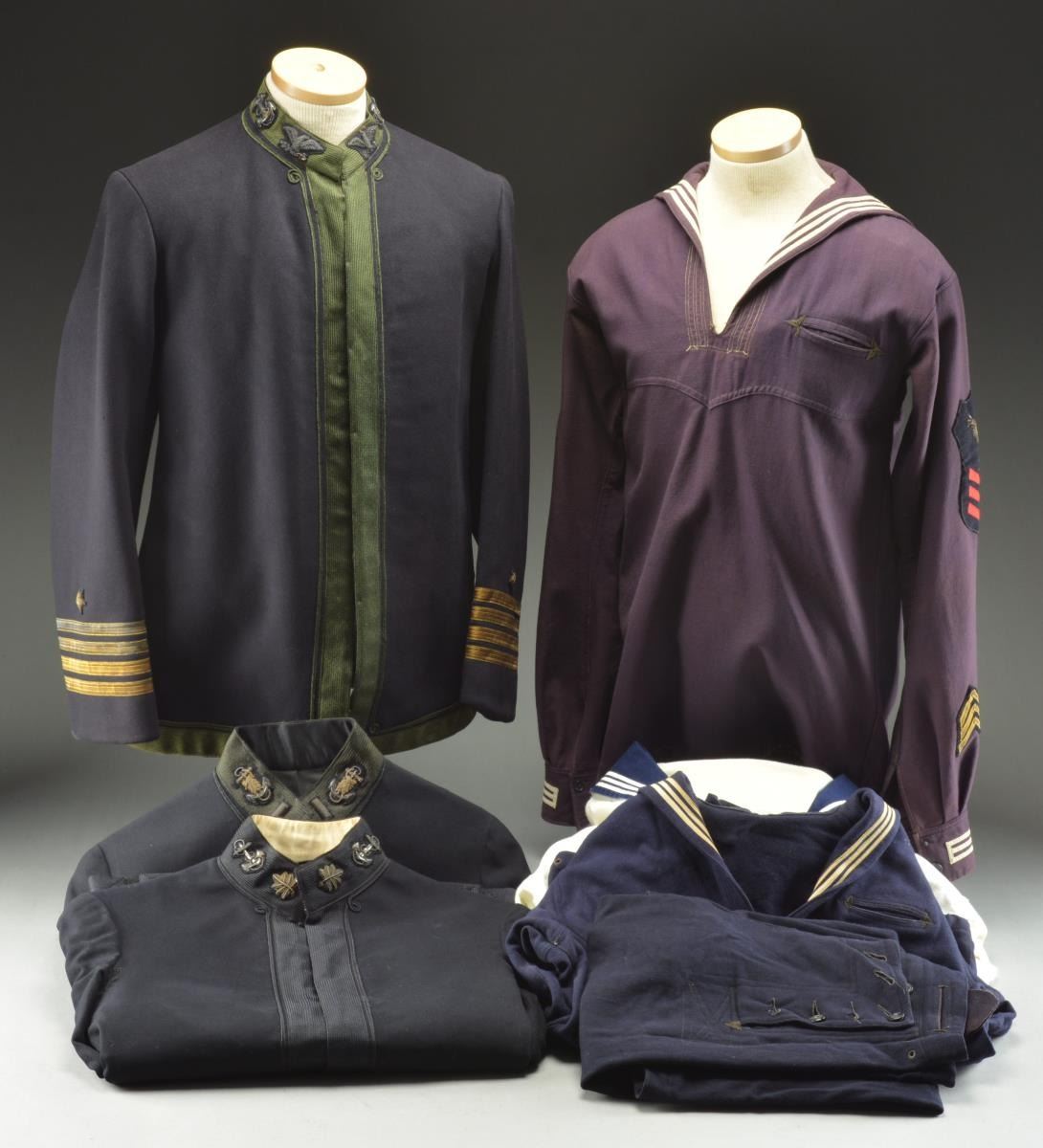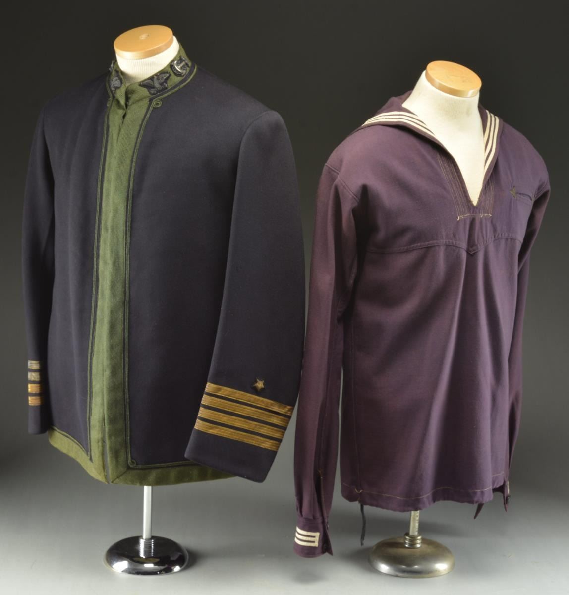 4) STOREKEEPER. A blue US Navy enlisted jumper likely of the Spanish American War period with a very interesting silver bullion shield shaped rating badge for a 1st Class Storekeeper on velvet sewn to the left sleeve. Below the rating badge are 3 gold bullion overseas chevrons. The right sleeve has a silver bullion Rifleman qualification badge. CONDITION: uniform is a bit faded but in fine shape overall.
