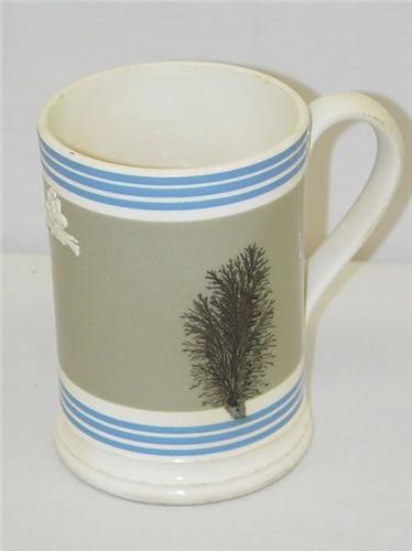 6" ENGLISH MOCHAWARE TANKARD W/ BLACK SEAWEED DECORATION & BLUE BANDS - SMALL 1 1/2" HAIRLINE, STAINS