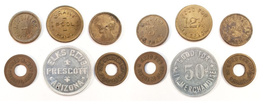 (6) DEL MONTE // 12½¢ Brass holed as made, J.P. DILLON // 5¢ Brass, ELKS CLUB // 50¢ Aluminum, THE GRAND 12½¢ // ELK PICTORIAL Brass, GRANT POOL HALL // 12½ Brass - High Quality, FRED A. MAY // 12½¢ Brass holed as made.