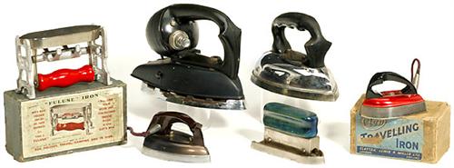 6 englische Bügeleisen 1) Spiritus-Eisen, Modell "DN 250", ohne Ventil. - Und: 2) Elektro-Eisen, Modell "Junction". - Sowie: 3-6) 4 kleine Reise-Bügeleisen, mit Schachteln.