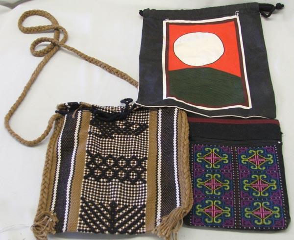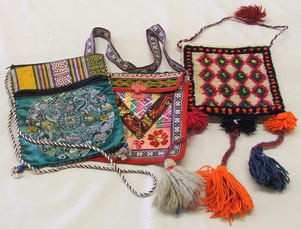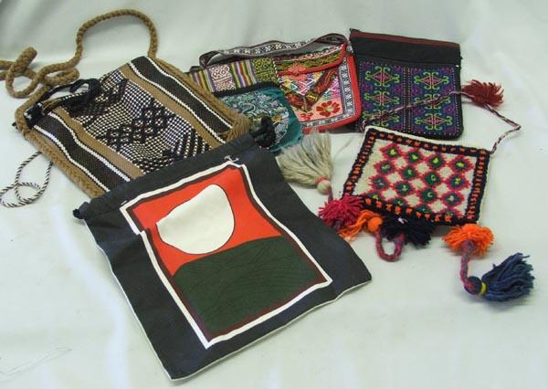 6 Ethnic Purses & Pouches, includes: 1 purple, Guatemalan Tassle, 1 Japanese Black & White, 1 Brown & Black Oaxacan, 1 Oriental Green Pouch Broken Zipper, 1 Red Brocade Pouch, largest measures approx. 20'' x 6.25''. SHI $15.