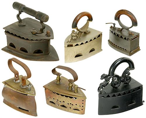 6 Kohle-Bügeleisen 6 europäische Bügeleisen, Messing- oder Eisenguß, teilweise mit verzierten Verschlüssen, Längen 18-30 cm.