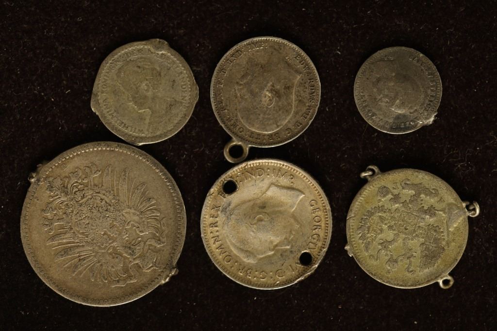 SWEDEN 10 ORE (.0205 OZ. ASW), 1878-S GERMAN 1/2 MARK (.0802 OZ. ASW). 1898 RUSSIA 10 KOPEKS (.0289 OZ. ASW), 1902 GREAT BRITAIN 3 PENCE (.0387 OZ. ASW), 1914 NEDERLANDS 10 CENTS (.0228 OZ. ASW) AND 1942 AUSTRALIA 6