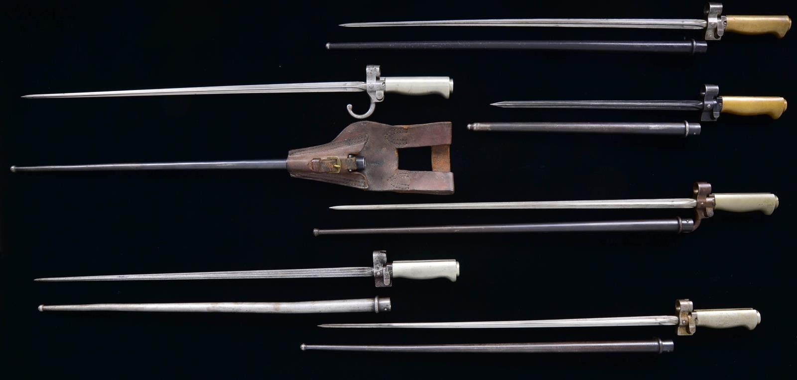 3) Model 1886 w/ 20 1/2" quadrangular blade. Crossguard w/out quillon. S# on crossguard. Silver colored alloy grip. Tubular steel scabbard. CONDITION: bayonet has wear, light oxidation, scattered spots of pitting & handling marks. Scabbard is turned overall gray w/ oxidation, sm. dents & handling marks.