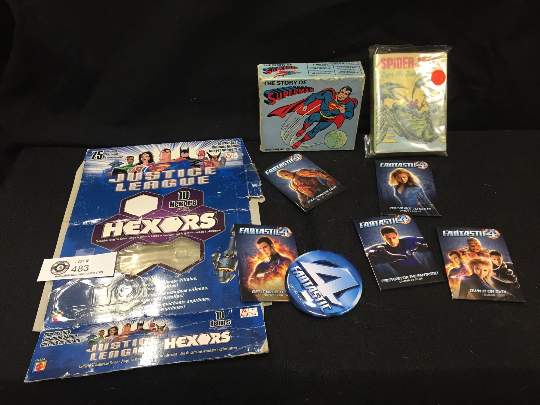 6 Fantastic 4 Buttons. Hexors Package Vintage Superman and Spiderman