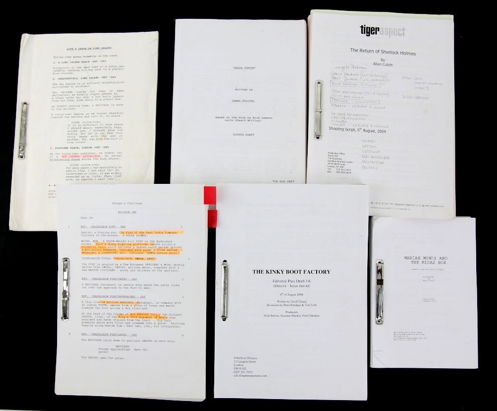 6 Film / TV Scripts including, Love and Death on Long Island, Rogue Trader, The Return of Sherlock Holmes (2004), Sharpe's Challenge, The Kinky Boot Factory (Kinky Boots) & Mariah Mundi and The Midas Box (6).