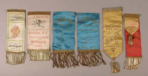 6 fireman's ribbons - Cortland 1884/Syracuse 1885/Utica 1884/Hudson 1885/Troy 1895/Troy 1895. Ex. cond.