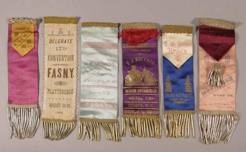 6 fireman's ribbons - Homer/Plattsburgh 1889/Syracuse 1885/Ithaca, NY/Schnectady, NY/Middletown 1883. Ex. cond.