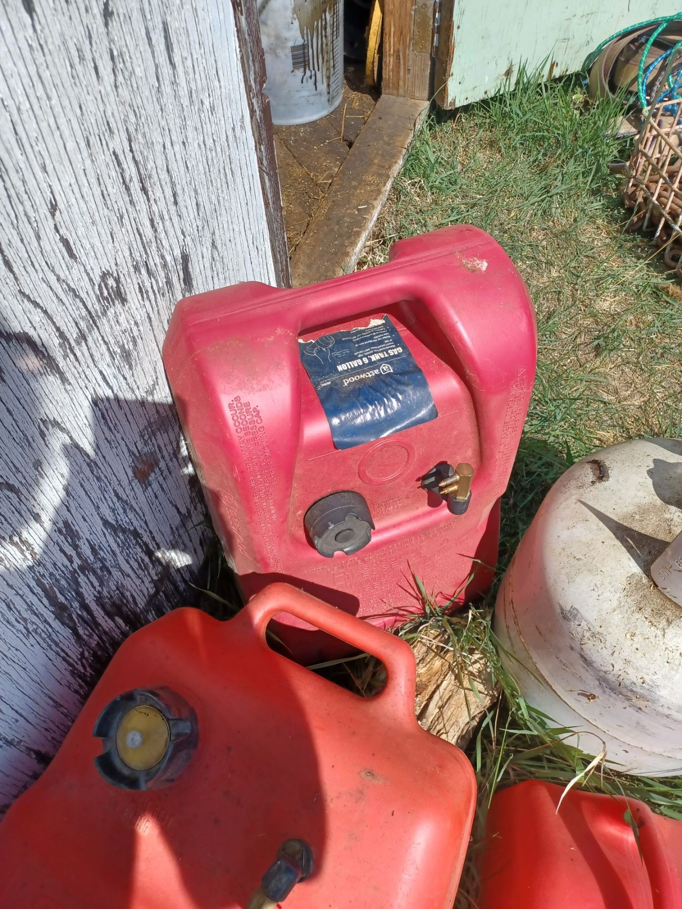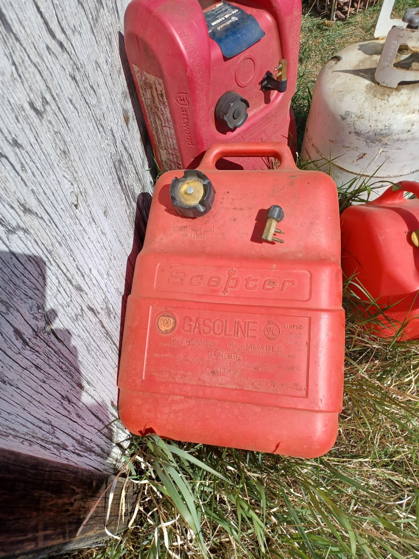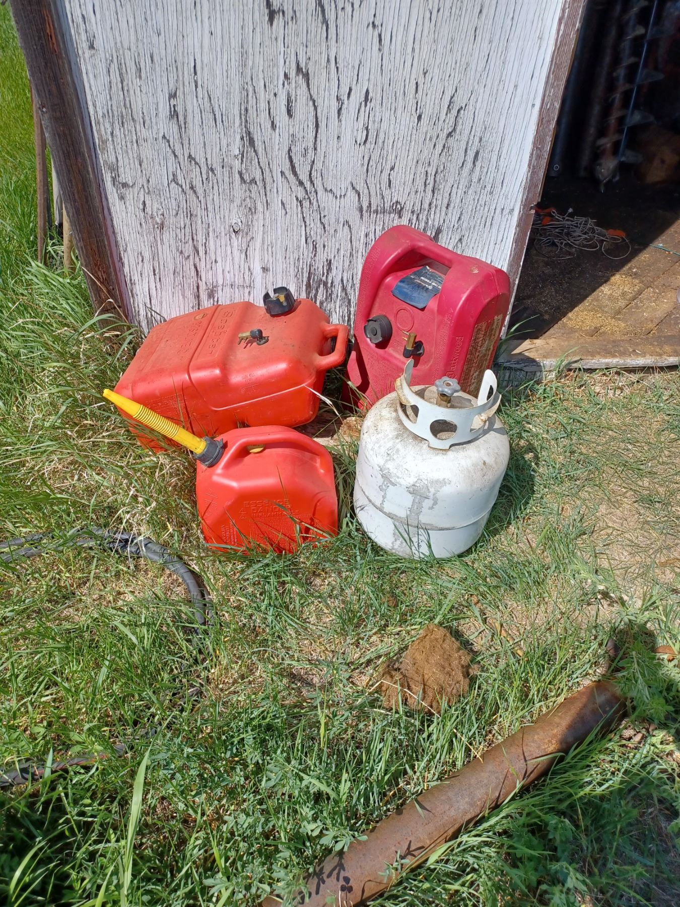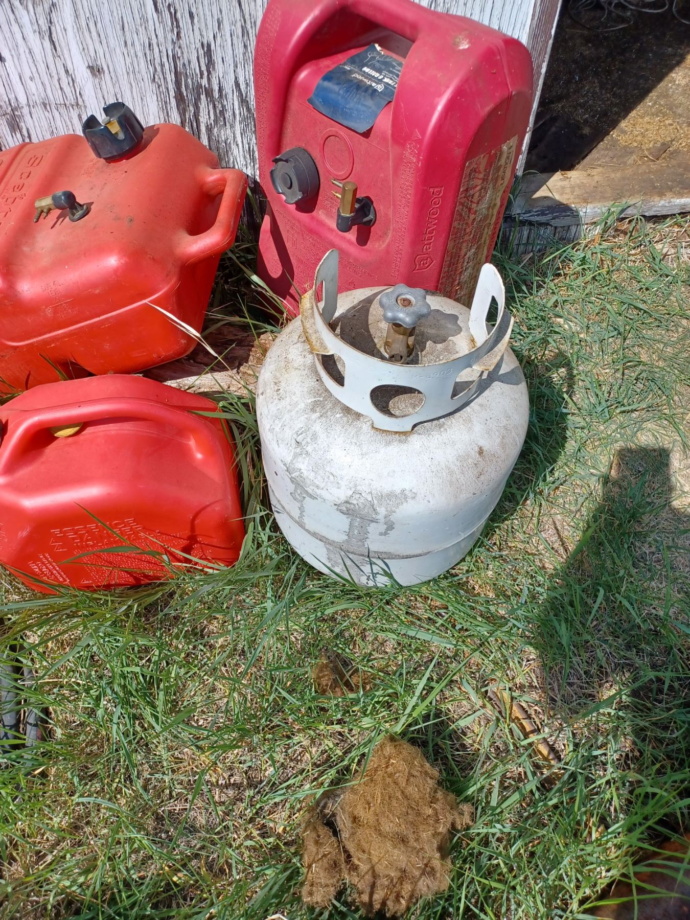 6 & 8 GAL JERRY CANS (QTY 2) USEFUL FOR OUTDOOR UTV/ATV/SPORTS + ONE 20LBS PROPANE TANK; AND ONE 2.5GAL GAS CAN