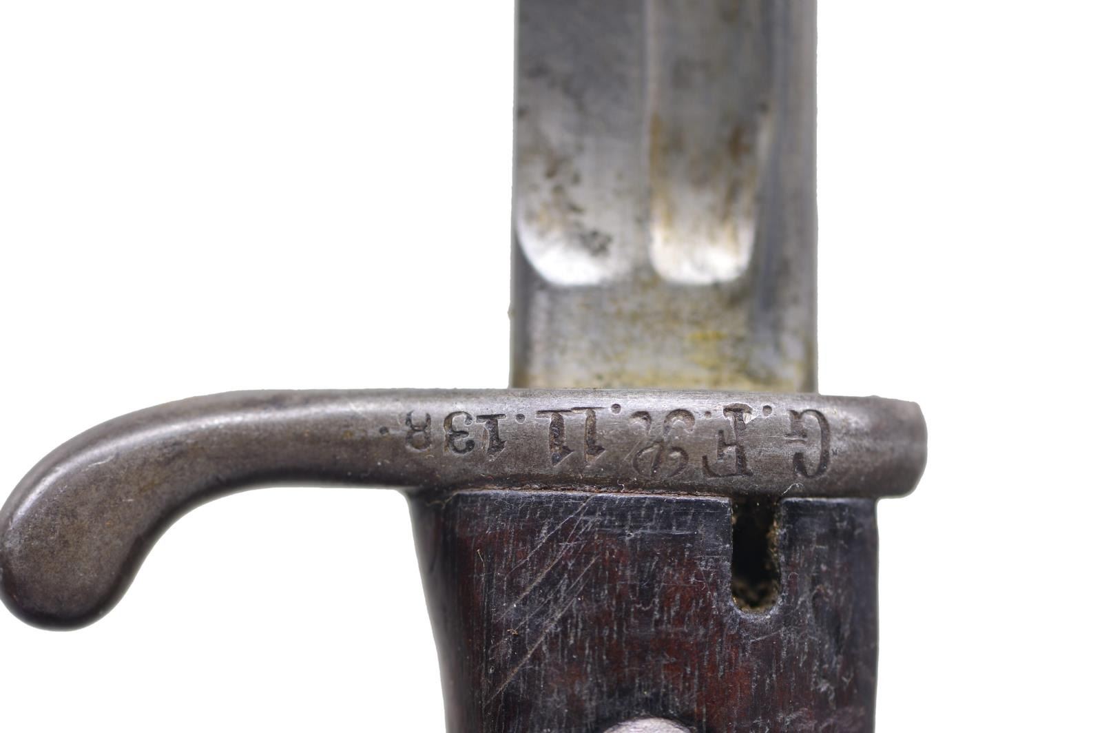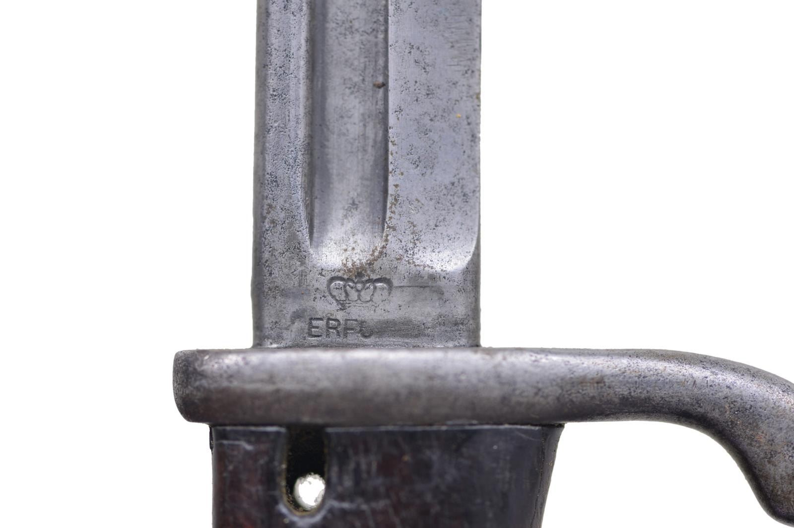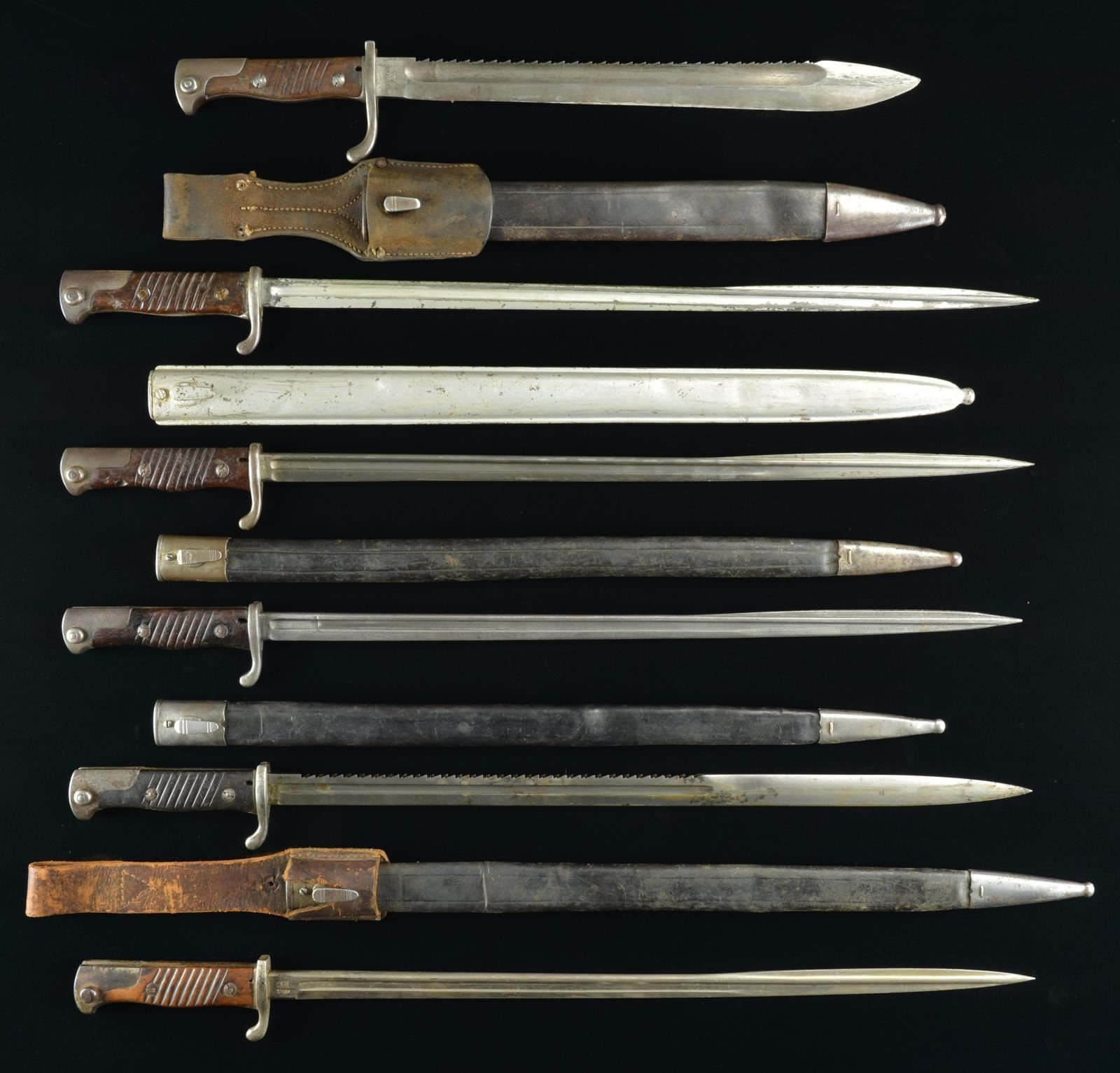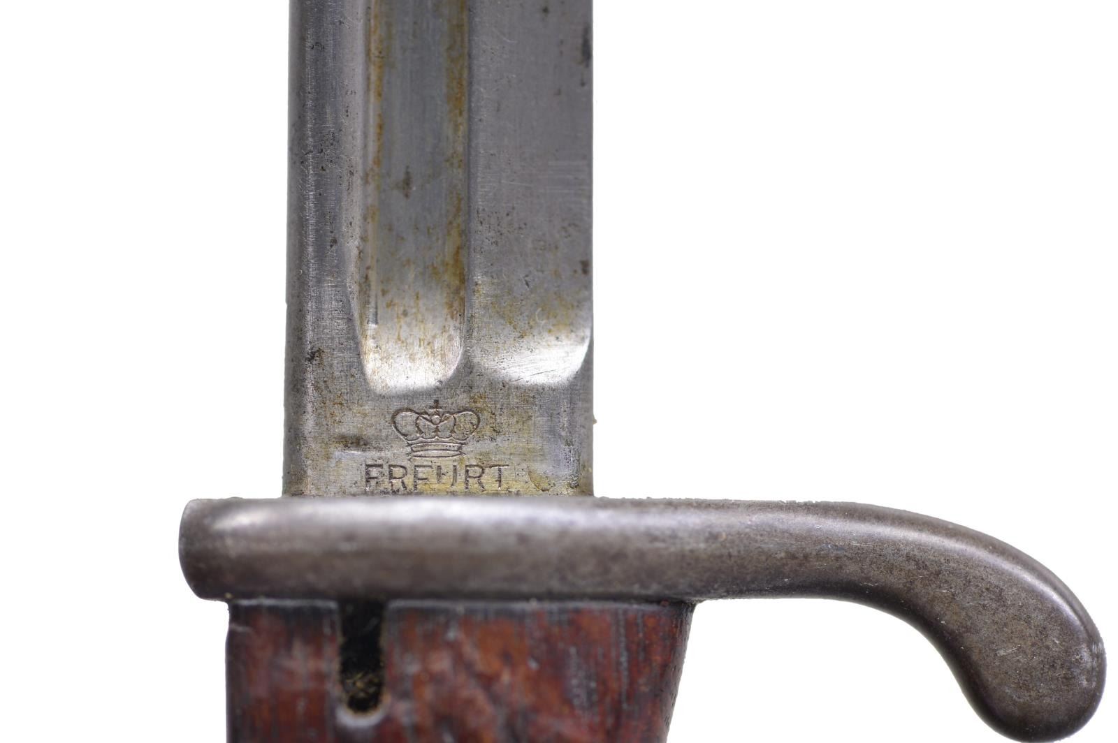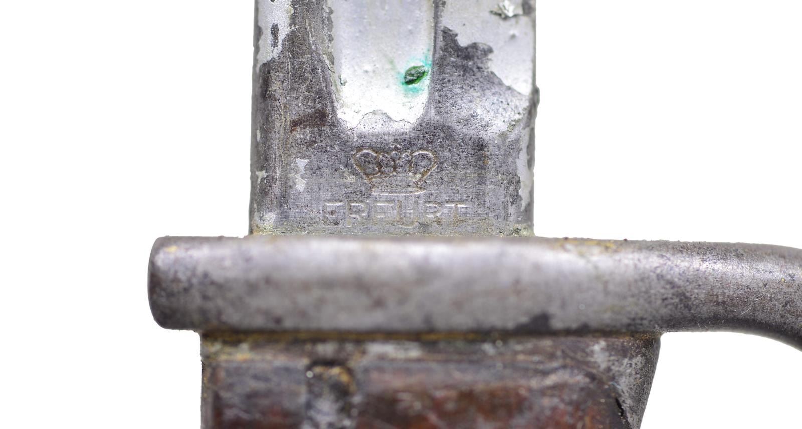 3) ERFURT MODEL 1898 1ST PATTERN BAYONET & SCABBARD. Overall: 25 3/4". Blade 20 1/2". Spine marked w/ German proofs & "02" date. Crossguard regimentally marked "G.F.R.11.138.". 1 Piece grooved wood grip. Leather scabbard w/ metal parts. CONDITION: good bayonet w/ blade being sharpened, light patina appearance overall & handling marks on grip. Good scabbard w/ patina on metal parts & scuffs on leather.