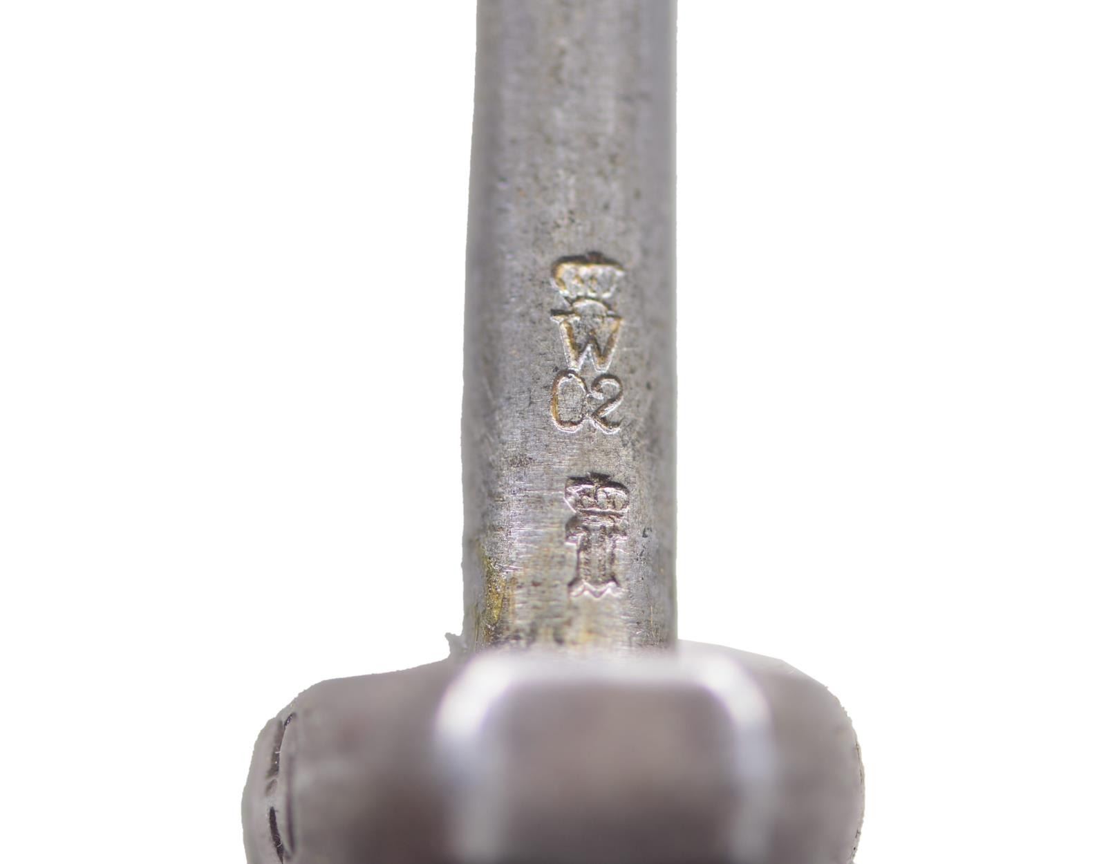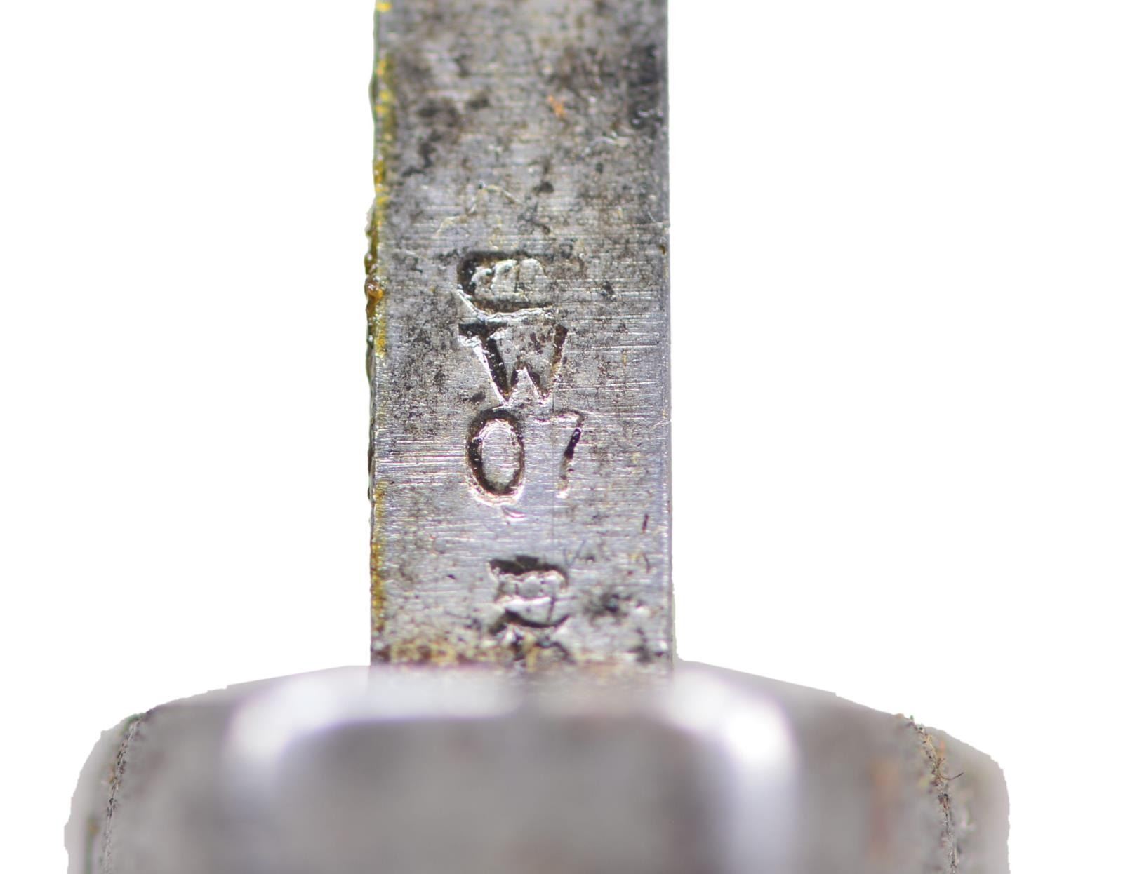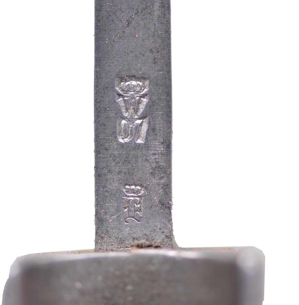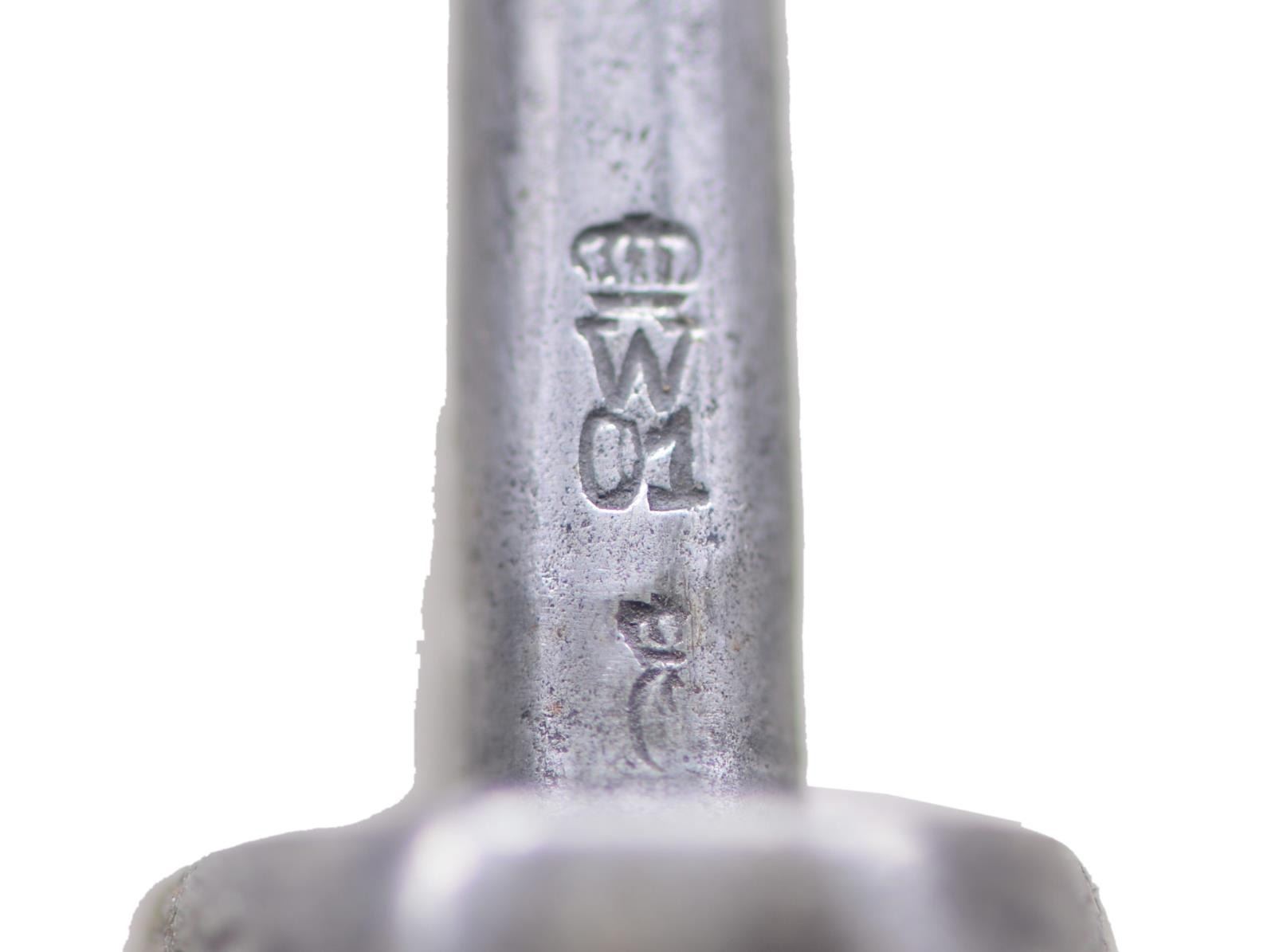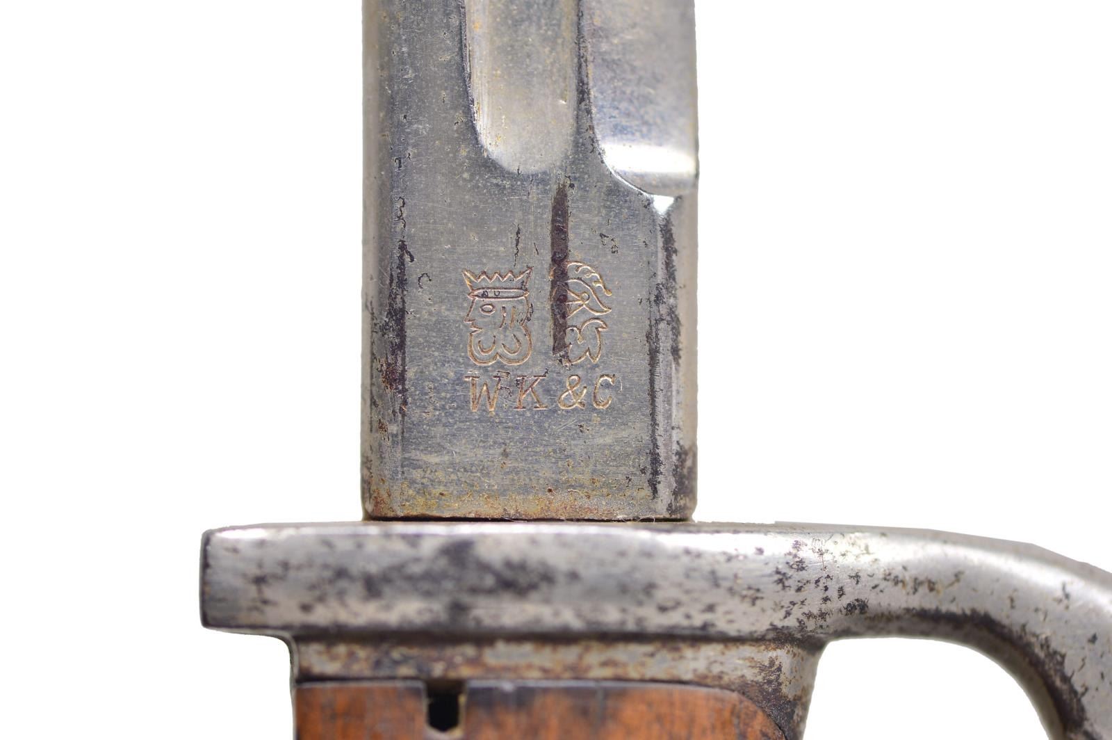 4) WK & C MODEL 1898 2ND PATTERN BAYONET. Overall: 25 3/4". Blade 20 3/4". Metal appears to be nickel plated. 2 Piece wood grips w/ later replacement screws. CONDITION: Good overall w/ dark patina & flaking finish; notably on pommel. Good grips w/ light wear.