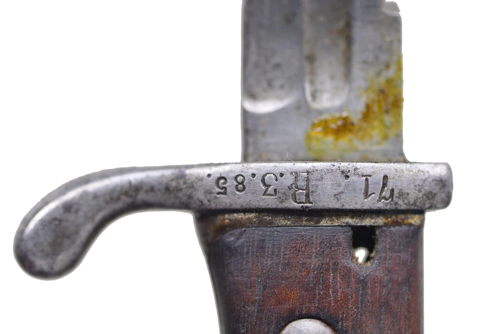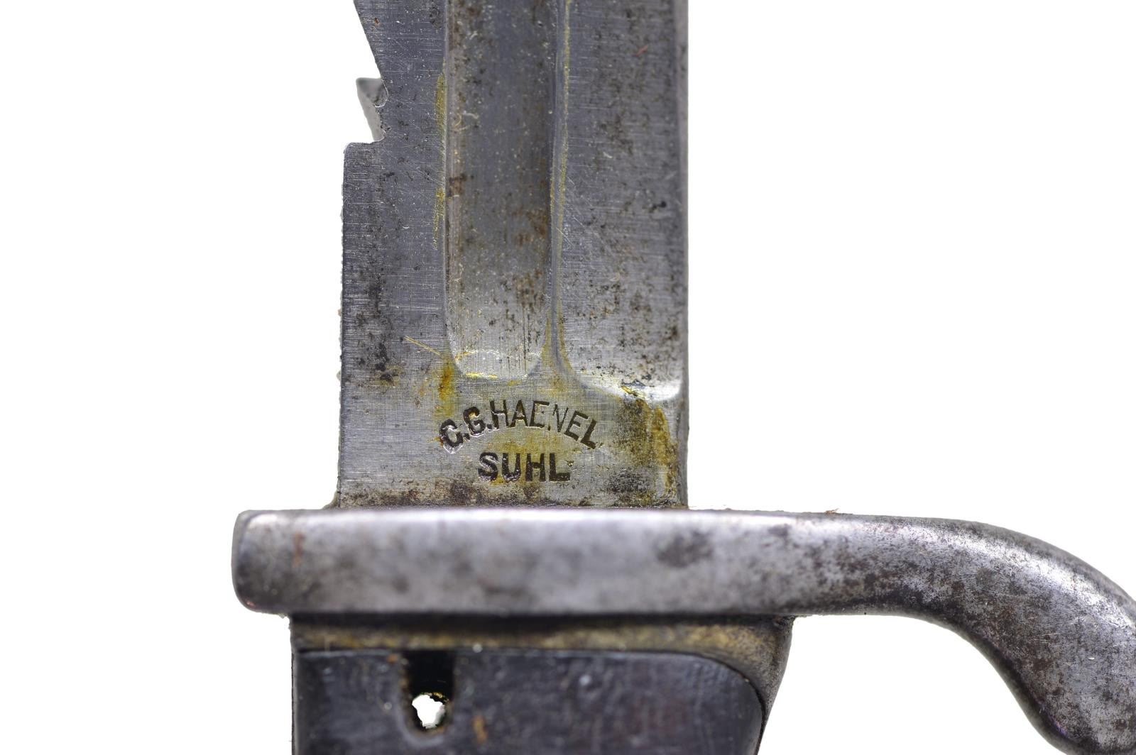 1) C. G. HAENEL MODEL 1898 2ND PATTERN SAWBACK BAYONET & SCABBARD. Overall: 25 3/4". Fullered blade 20 1/2". Spine has10 3/4" sawback section along w/ German proofs & "07" date. 2 Piece wood grip panels w/ WWII style grip screws. Crossguard is regimentally marked "71.R.3.85". Leather scabbard w/ frog. CONDITION: good bayonet w/ spots of patina, blade has been sharpened & grips have marks. Good intact scabbard w/ patina on metal parts. Fair frog has worn scuffed leather & missing piece retaining stud.