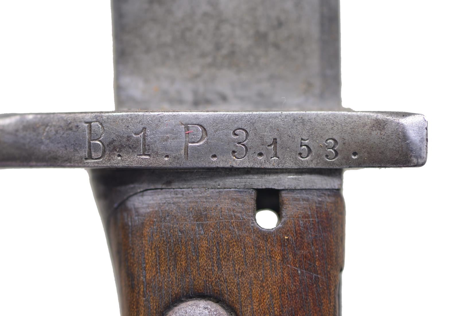 6) ERFURT 1898/05 SAWBACK BAYONET W/ SCABBARD. Overall: 19 1/2". Fullered blade: 14 3/8". Spine has 10 1/2" sawback section along w/ German proofs & "07" date. Crossguard regimentally marked "B.a1.P.3.153.". 2 Piece wood grips w/ later replacement screw heads. Leather scabbard w/ brown leather frog. CONDITION: good bayonet w/ wear, patina & blade having some sharpening. Good intact scabbard w/ scuffs, patina on metal parts. Good intact frog w/ a few missing rivets. (02-17165-1/MD). $500-750.