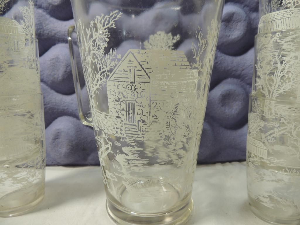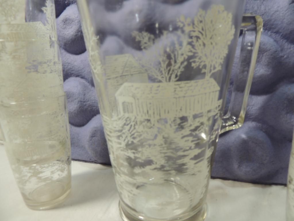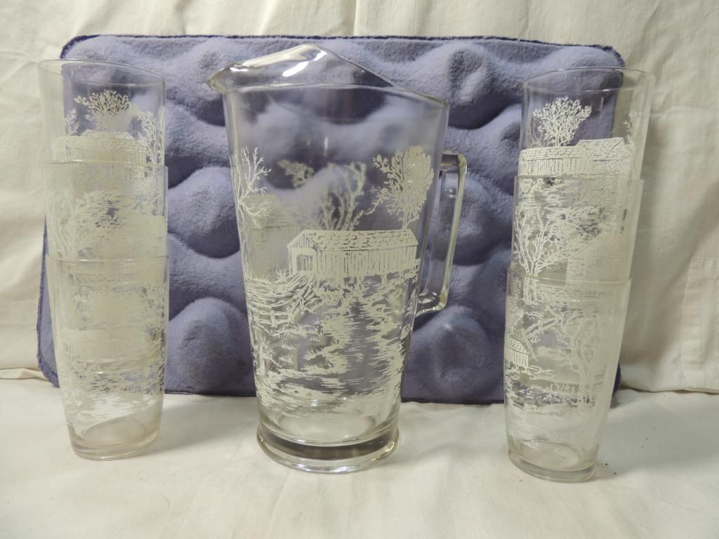 WHITE COVERED BRIDGE SCENE. 6 GLASSES AND DRINK PITCHER. AS SHOWN. SEE PHOTO FOR MORE DETAILS.