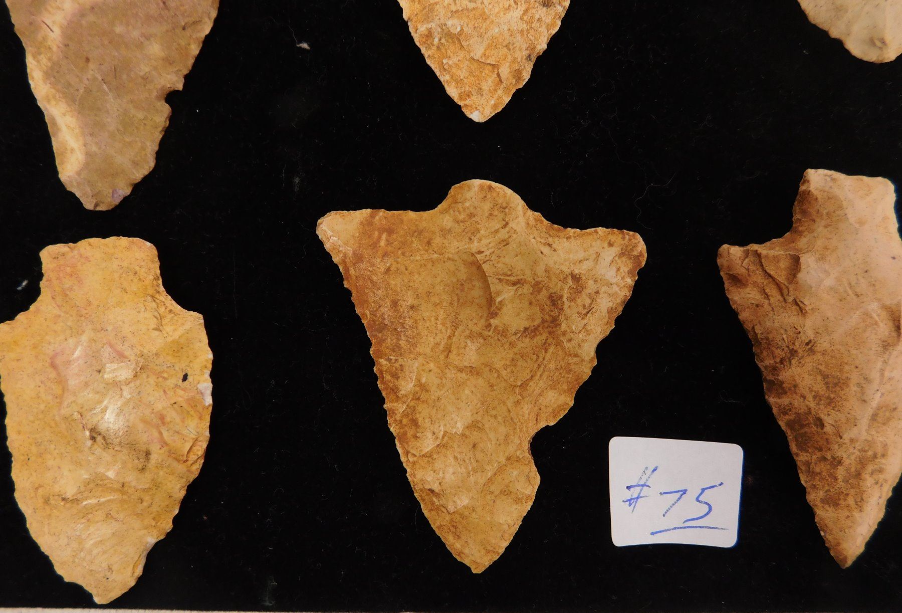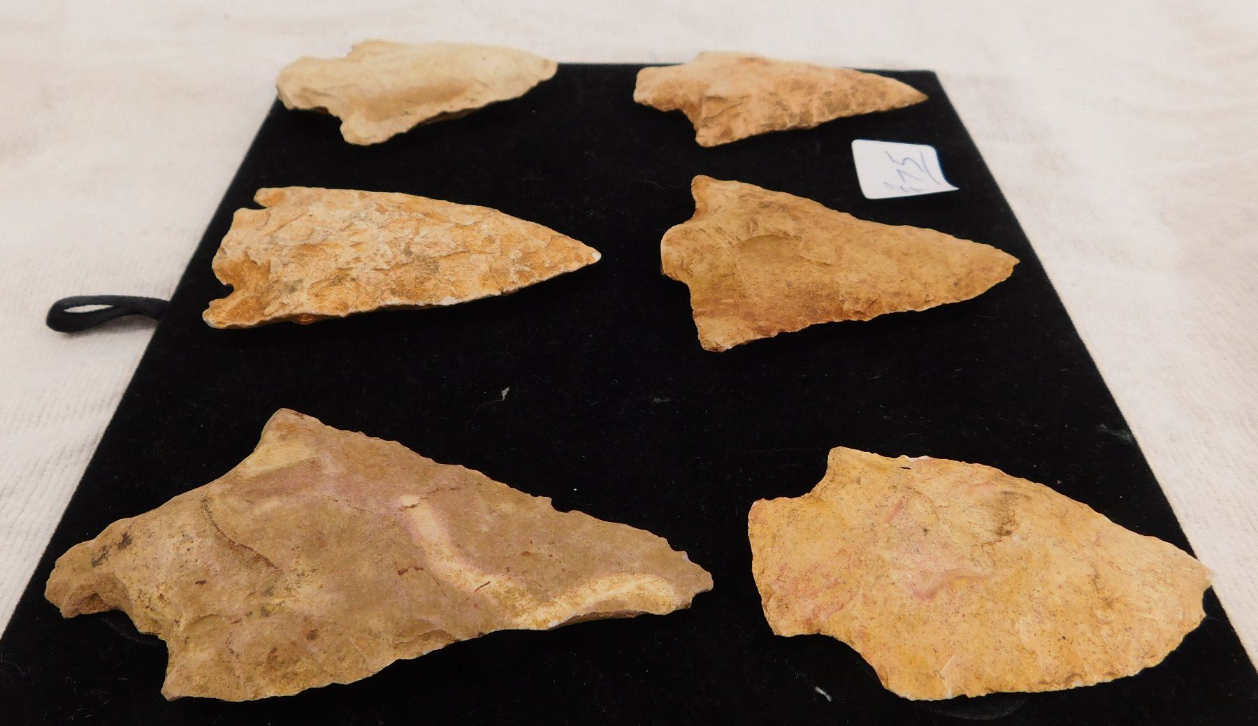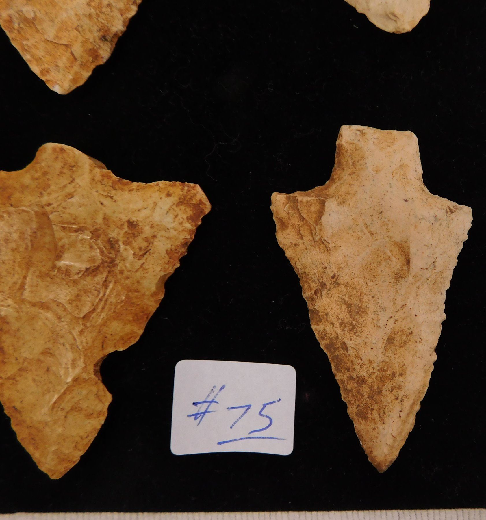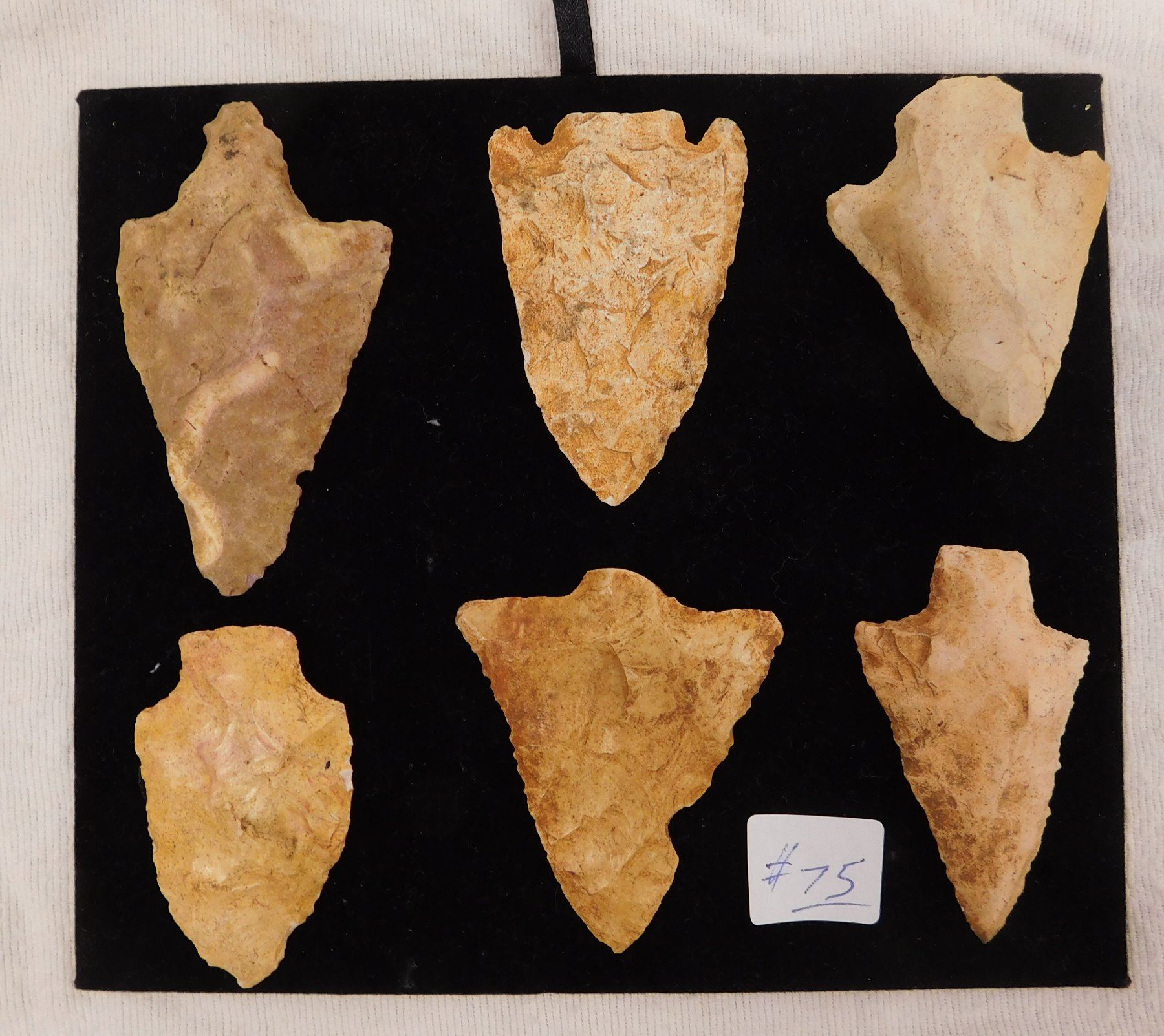 6 Georgia Spearheads, circa 5000 years old. Made of chert, the items measure from 3 3/4" to 2 3/4". Terrell County, Georgia. Found in the 1940s walking in the woods; all points are stem based. Condition: Some damage, as found, see images. Shipping: $18.50 w/insurance and signature.