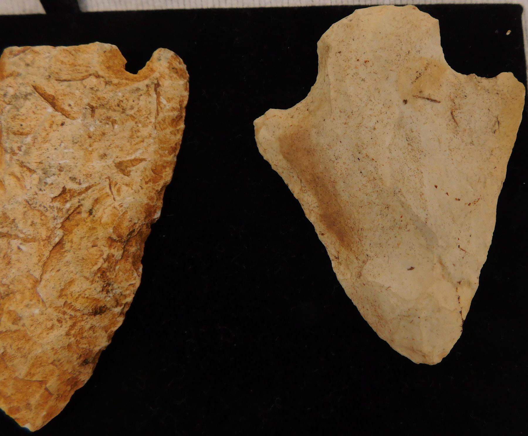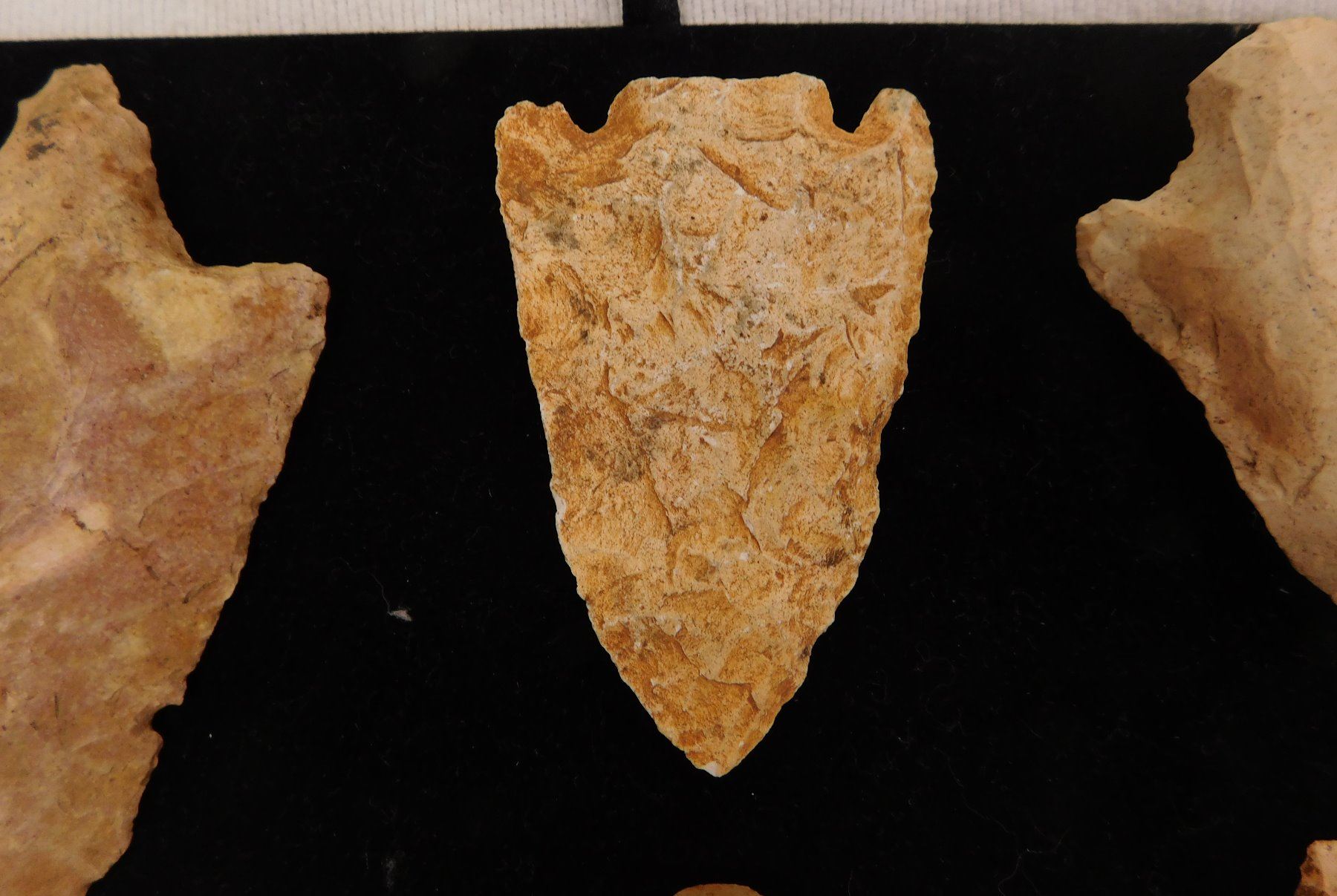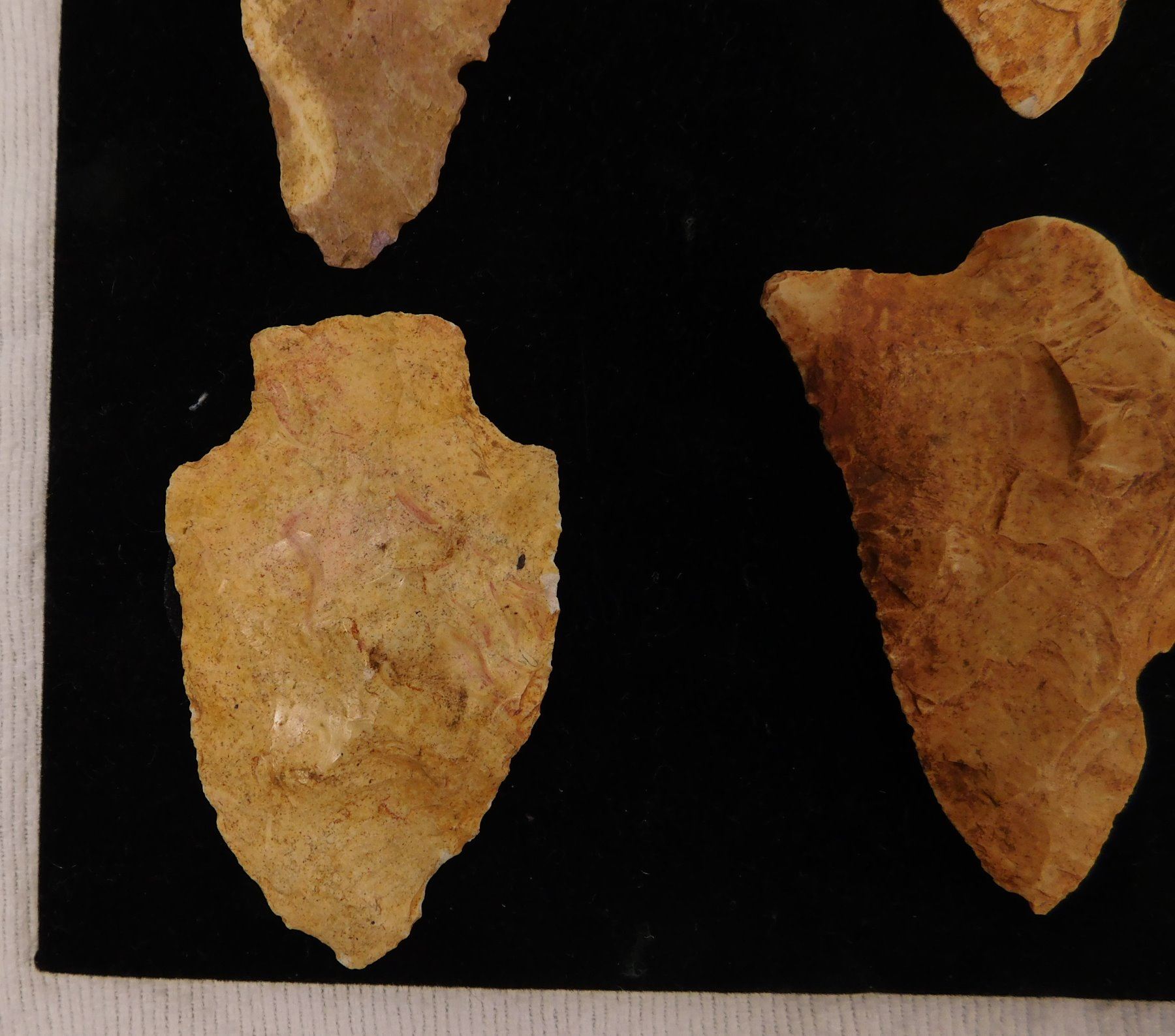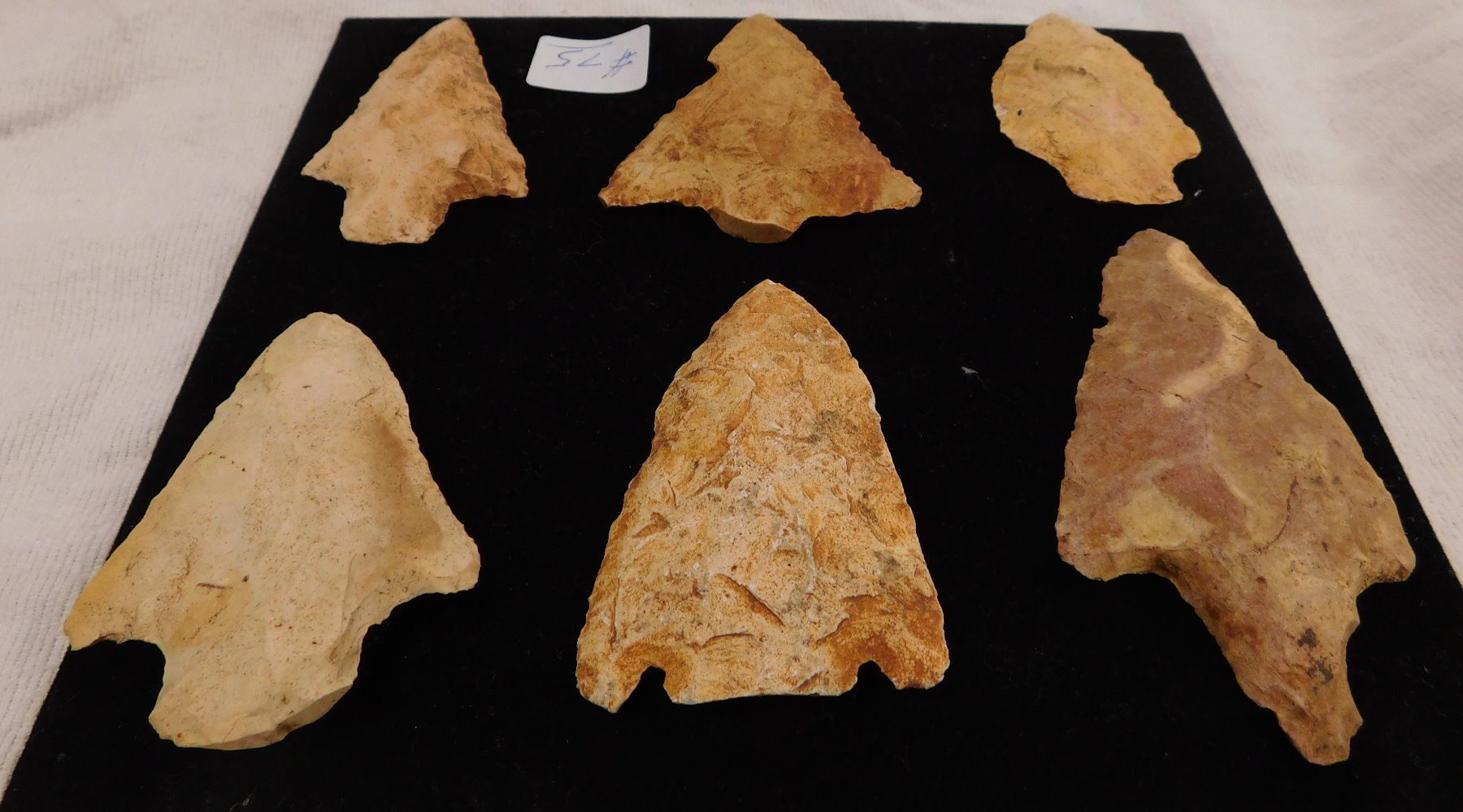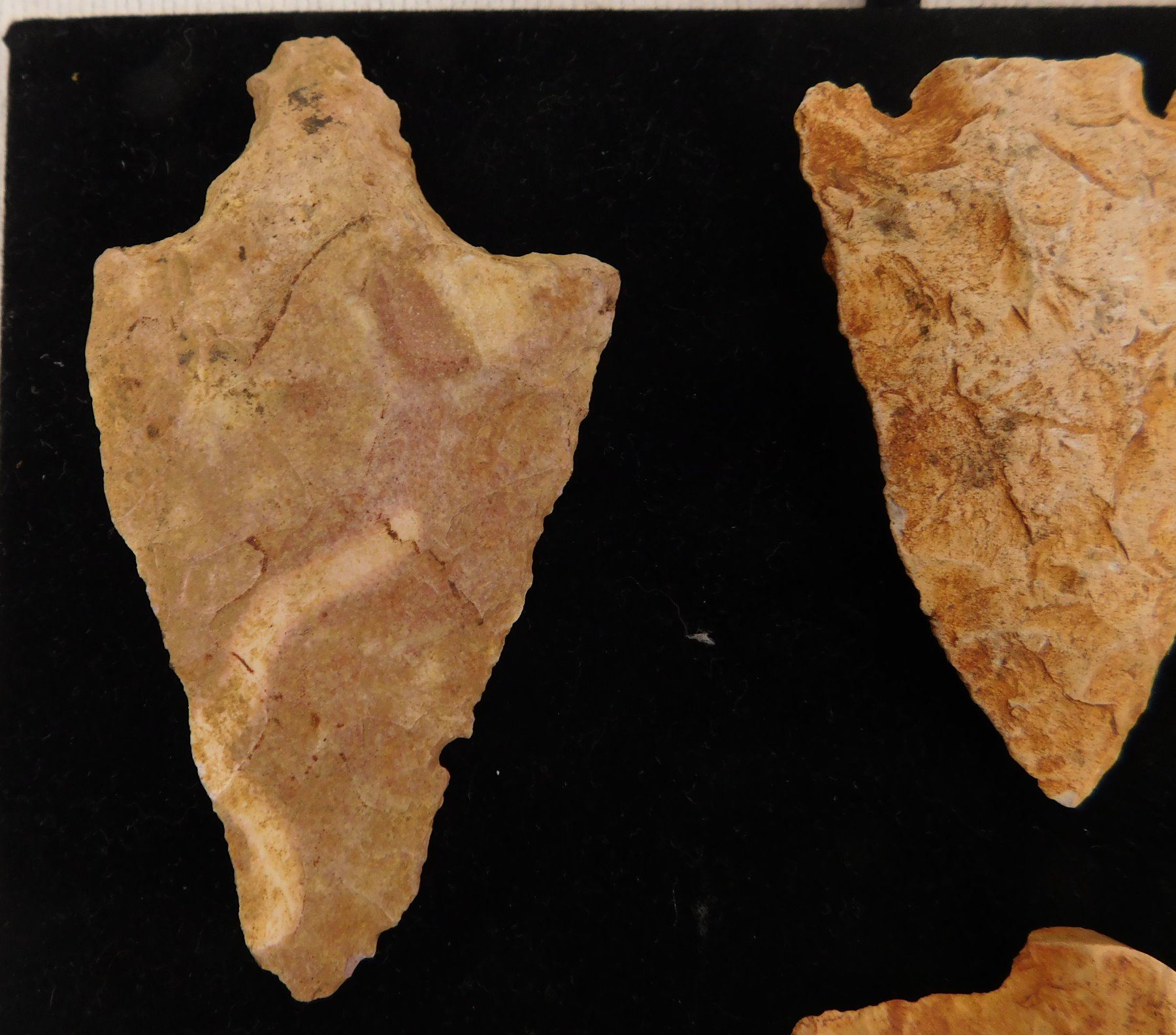 6 Georgia Spearheads, circa 5000 years old. Made of chert, the items measure from 3 3/4" to 2 3/4". Terrell County, Georgia. Found in the 1940s walking in the woods; all points are stem based. Condition: Some damage, as found, see images. Shipping: $18.50 w/insurance and signature.