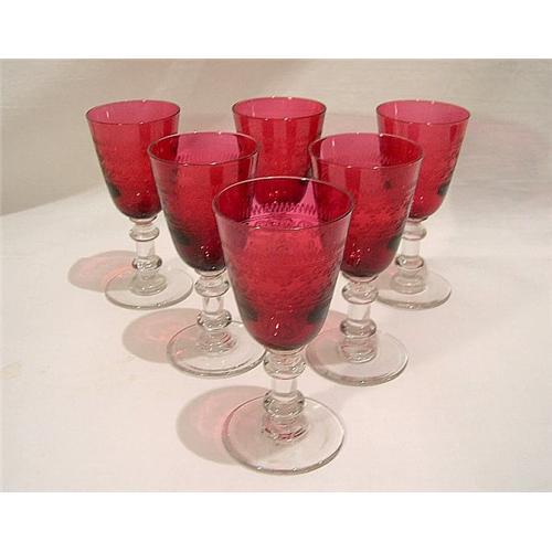 6 Wine?s Glass Cups in Cranberry color. Probably French. In very good conditions, without any chipo or crack. Doesn?t have any sign. Probably 1900. The glass is worked, the foot it?s very well done.