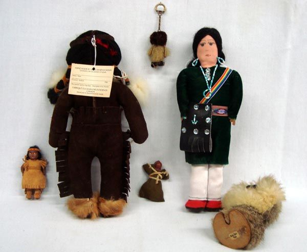 Native American Dolls. Four are southwest and two are northwest (Alaska). It includes a Navajo woman in green dress, a dark brown suede-clad doll with a tag from Canada (12''H x 7''W), two small dolls, one keychain doll and a medium size fur-clad doll.