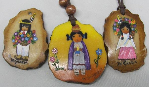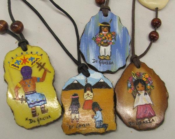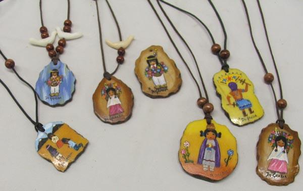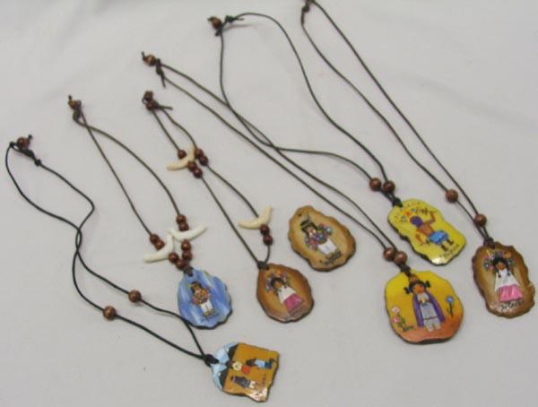 6 Hand printed Reproductions Authorized by De Grazia Necklaces and 1 pendant, longest measures approx. 26'' end to end and pendant 2'' in diameter. SHI $15.