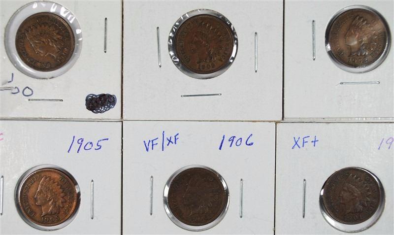 6 INDIAN HEAD CENTS; 1901, 1902, 1906 XF; 1905, 1906 F/VF; 1909 XF/AU