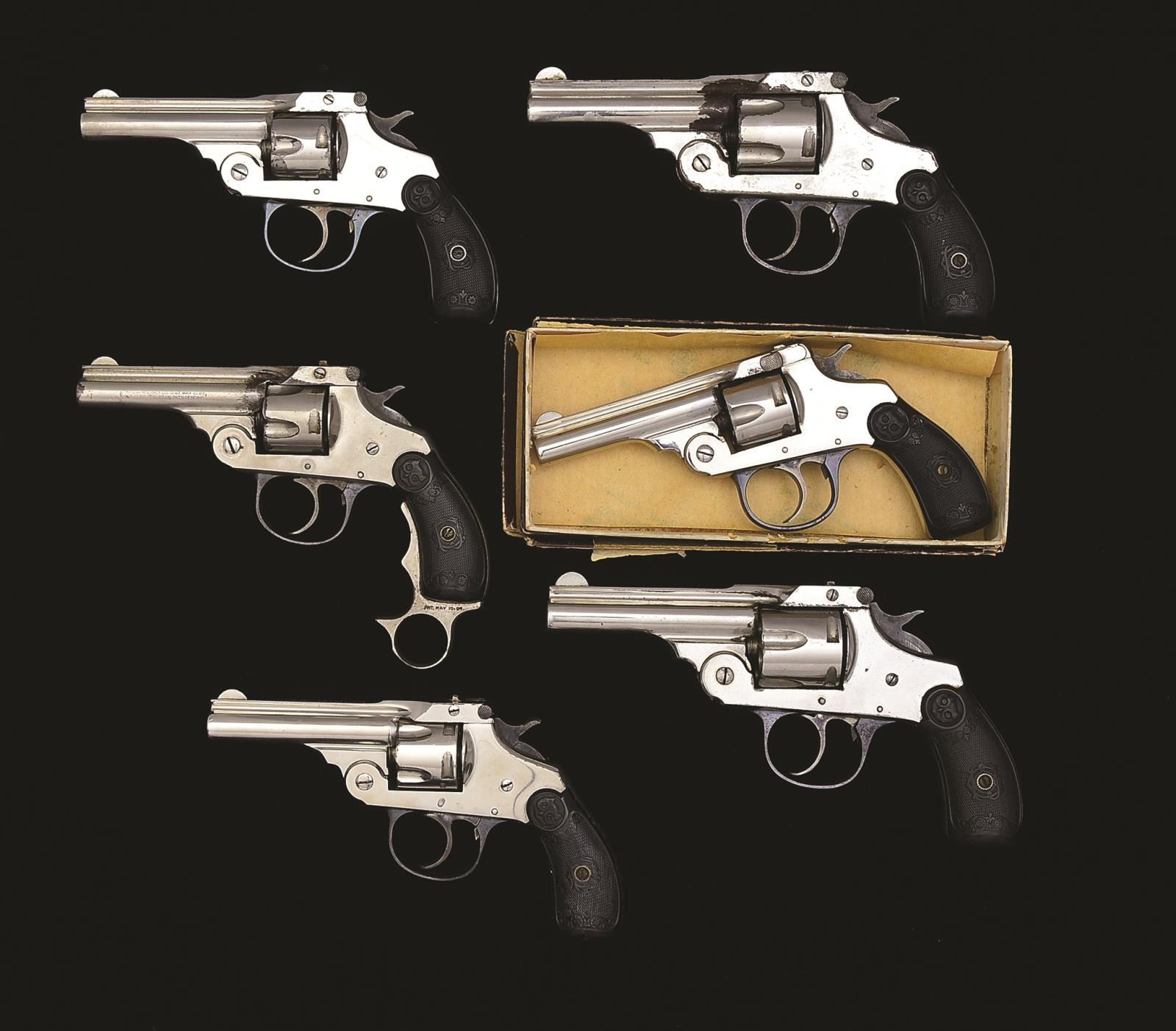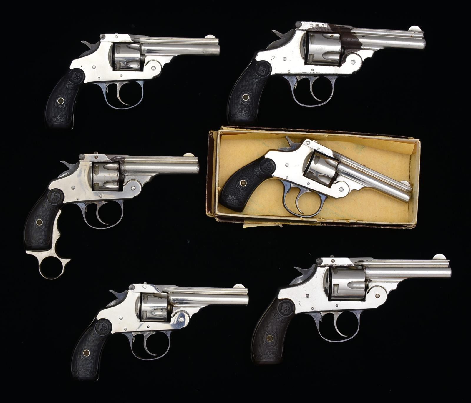 ALL: nickel finished actions w/ blued trigger guards. Case colored hammers & triggers. 2 Piece checkered hard rubber owl's head grips. 1) SMALL FRAME SECOND MODEL. Cal. 32 S&W. S# E13668. Bbl. 3 1/8" w/ rib, semi circular front sight & V notch rear sight. 5 Shot fluted cyl. Double top post latch action. Mfg. 1898. CONDITION: over 90% metal finish showing sm. spots of flaked nickel. Very good grips. Bore is bright w/ strong rifling. Sound mechanics. (01-18131/DS). ANTIQUE. 2) SMALL FRAME FIRST MODEL. Cal. 32 S&W. S# 38736. Bbl. 3 1/8" w/ rib, semi circular front sight & V notch rear sight. 5 Shot fluted cyl. Double top post latch action. Mfg. 1895. CONDITION: over 75% nickel finish w/ area of rust & pitting on backstrap & bottom of grip. Grips have cracks & chips at bottom. Bore retains strong rifling showing scattered spots of light pitting. Trigger return spring is collapsed. (01-18132/DS). ANTIQUE. 3) SMALL FRAME FIRST MODEL. Cal. 32 S&W. S# 2085. Bbl. 3 1/8" w/ rib, semi circular front sight & V notch rear sight. 5 Shot fluted cyl. Double top post latch action. Fitted w/ the scarce "Bourne Knuckle Duster" grip attachment. Mfg. 1895. CONDITION: 75% nickel having a slightly dull appearance. Grips show light wear. Bore retains sound rifling showing some light pitting. Sound mechanics. (01-18133/DS). ANTIQUE. 4) SECOND MODEL FIRST VARIATION. Cal. 38 S&W. S# C17100. Bbl. 3 1/4" w/ rib, semi circular front sight & fixed V notch rear sight. 6 Shot fluted cyl. Dbl. top post latch action. Mfg. 1896. CONDITION: 90% metal finish showing spots of flaking nickel. Grips show light wear. Bore retains good rifling showing spots of very light pitting. Sound mechanics. (01-18134/DS). ANTIQUE. 5) SECOND MODEL FOURTH VARIATION. Cal. 38 S&W. S# G64426. Bbl. 3 1/4" w/ rib, semi circular front sight & fixed U notch rear sight. 5 Shot rnd. cyl. Dbl. top post latch action. Mfg. 1902. CONDITION: 70% nickel w/ lg. area of rust on top strap & rear portion of bbl. Grips show light wear. Dark pitted bore. Sound mechanics. (20-2099/DS). CURIO. 6) SMALL FRAME SAFETY AUTOMATIC. Cal. 32 S&W. S# A25553. Bbl. 3 1/8" w/ rib & semi circular front sight. 5 Shot fluted cyl. UNATTACHED ACCESSORIES: 2 piece box w/ proper label. Lid has torn & tattered flaps. CONDITION: over 90% metal finish w/ spots of flaking nickel. Very good grips. Dark pitted bore. Sound mechanics. (20-2125/DS). CURIO. $700-1,100.