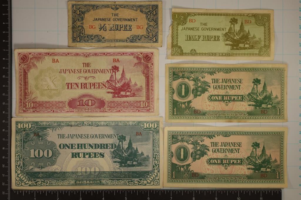 1/4 RUPEE, 1/2 RUPEE (SMALL TEAR LEFT SIDE), 2-ONE RUPEE'S, 1-TEN RUPEE AND 1-ONE HUNDRED RUPEE. (ONE OF THE 1'S AND THE 100 ARE CRISP)