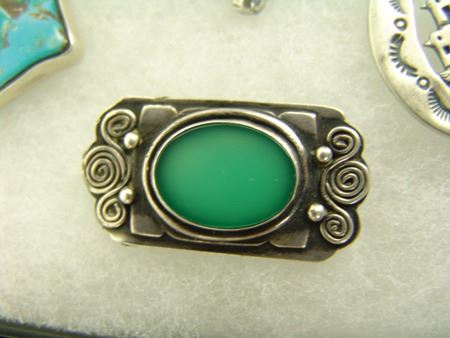 Mid/Late 1900s, Six all-silver items including single-stone and two-stone turquoise pendants and an old green jade pin, all from Mexico, plus a Native made mosaic diamond pendant, a crescent pendant with scene, and a great Navajo Liberty Bell pendant marked "76." All but one with turquoise. Largest 2"
