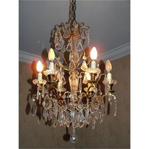 A fine French bronze and crystal chandelier, 6 lights , bronze frame and lead crystal pendants, rewired, measuring 27 inches H and 20 inches wide, shipping within US $ 110, packed in such a way that you will get it almost ready to hang, will not require qualified installer.