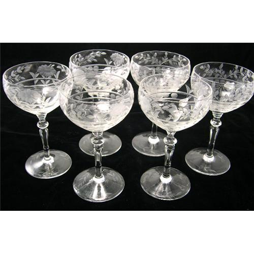 This is a lovely set of (6) 5 7/8 inch high antique Libbey Rock Sharpe crystal champagne or tall sherberts in the "Anniversary" pattern. All are in immaculent condition with no chips, cracks, or damage noted, and the pattern number is #2011. Add this fabulous set to your old fine crystal collection!
