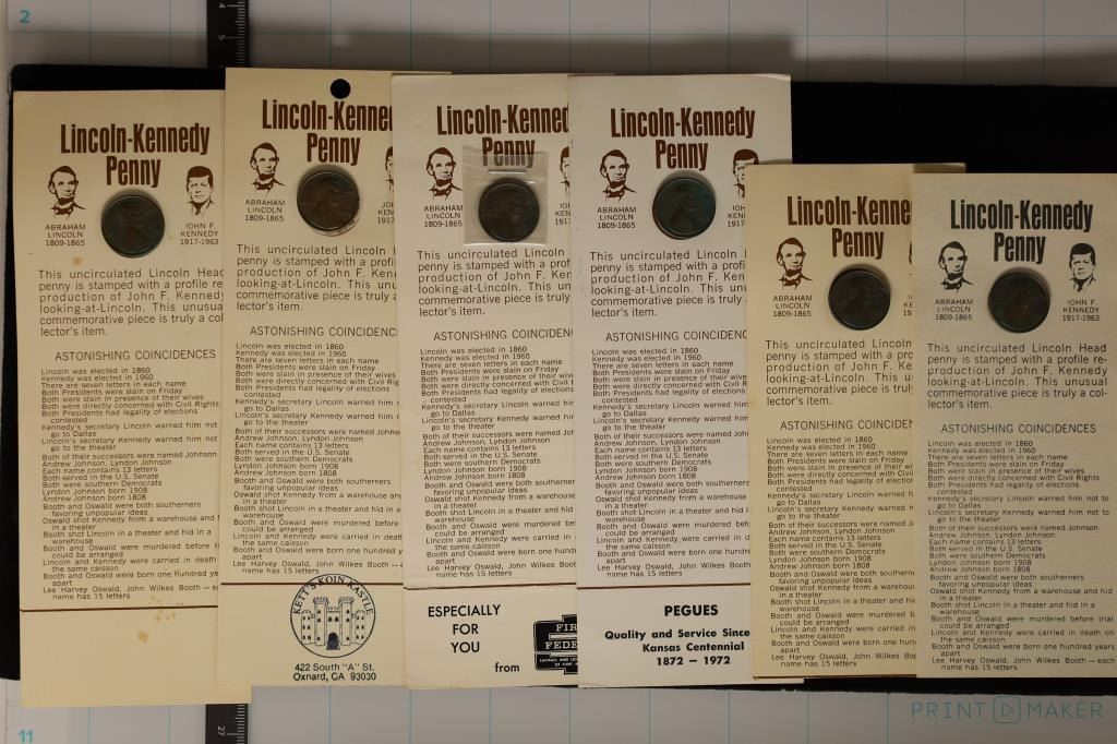 COINCIDENCES ON INFO CARDS. EACH LINCOLN CENT HAS A STAMPED PROFILE OF JFK ON RIGHT SIDE OF LINCOLN.