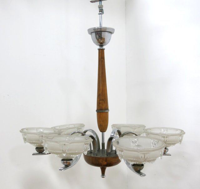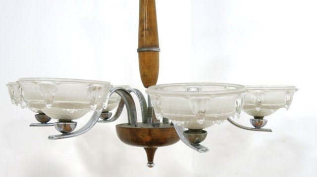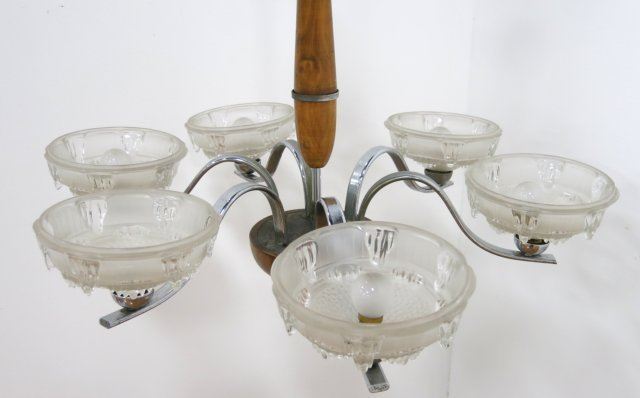 With frosted & molded shades. Burled wood & chrome frame. Approx. 32" H x 27" diameter. Good condition.