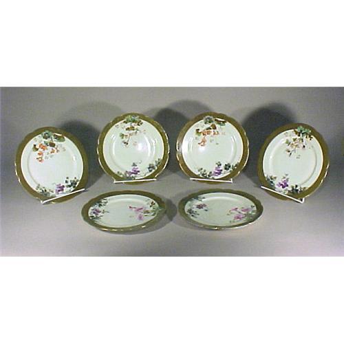 Here is a sensational set of 6 Limoges dinner plates that are masterful in design. The colors are vivid and naturalistic. The detail is exceptional! They all have purple enameled flowers ? with 2 having apricot, 2 having white, and 2 having pink enameled flowers embracing the edges of the plates in a fabulous free flowing form. The outer rim of each plate is gold gilded with an interior rim that is in a pale pea green with specks of gold enameling throughout. The plates are in very good condition ? with some minute wear to the gold gilding on the outer rim. They measure 9 ½? in diameter. They have an underglaze mark on the bottom of an M & R in green. You can find this same mark in the book Collector?s Encyclopedia of Limoges Porcelain by Mark Frank Gaston on page 269 for Martial Redon (1882-1890). In fancy script they are also marked in red RB.