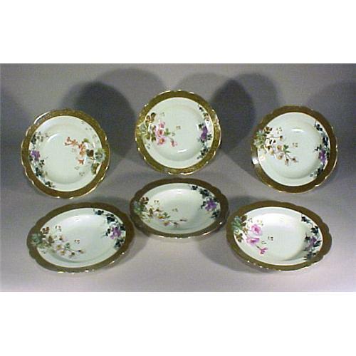Here is a sensational set of 6 Limoges soup bowls that are masterful in design. The colors are vivid and naturalistic. The detail is exceptional! There are purple, apricot and white enameled flowers embracing the edges of the bowls in a fabulous free flowing form. The outer rim of each bowl is gold gilded with an interior rim that is in a pale pea green with specks of gold enameling throughout. The bowls are in very good condition ? with some minute wear to the gold gilding on the outer rim. They measure 9 ¼? in diameter x 1 5/8?h. There is an underglaze mark on the bottom of an M & R in green. You can find this same mark in the book Collector?s Encyclopedia of Limoges Porcelain by Mark Frank Gaston on page 269 for Martial Redon (1882-1890). In fancy script it is also marked in red RB.