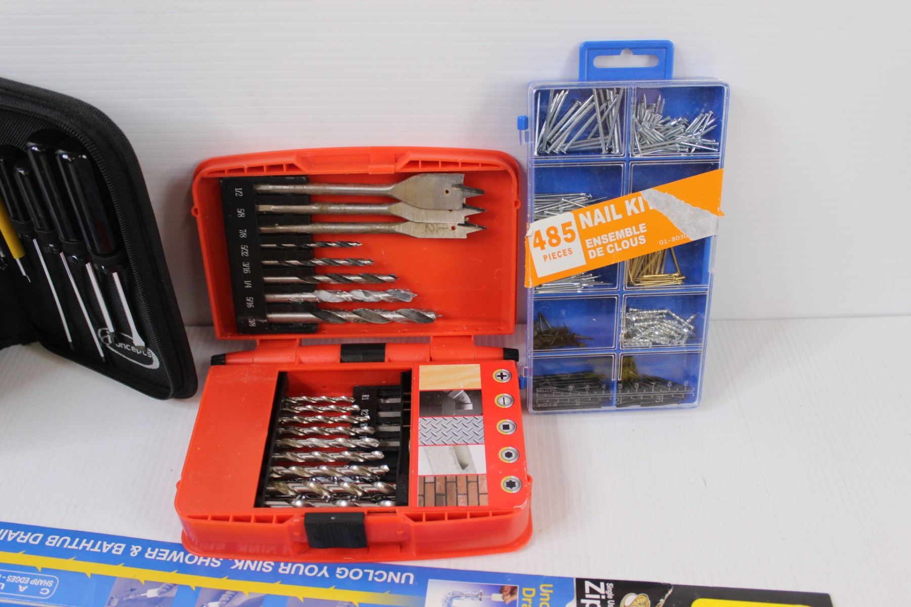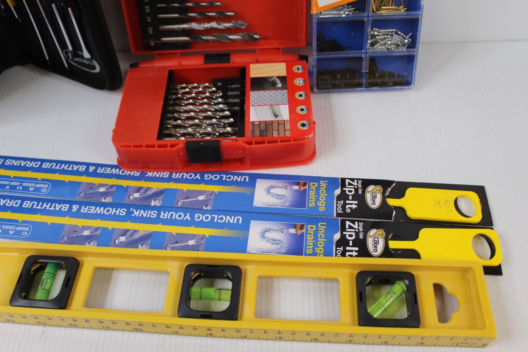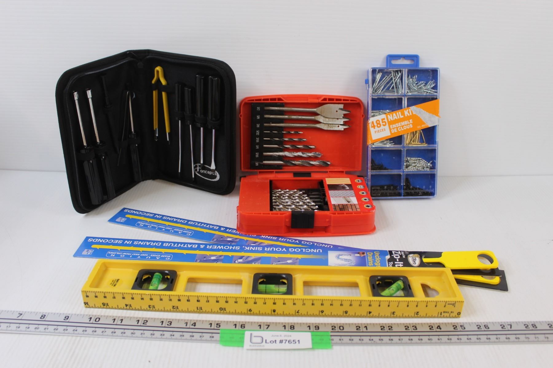 (6) Lot of Tools: Drill Bits; Screwdrivers; Drain Cleaners; Level & Nails