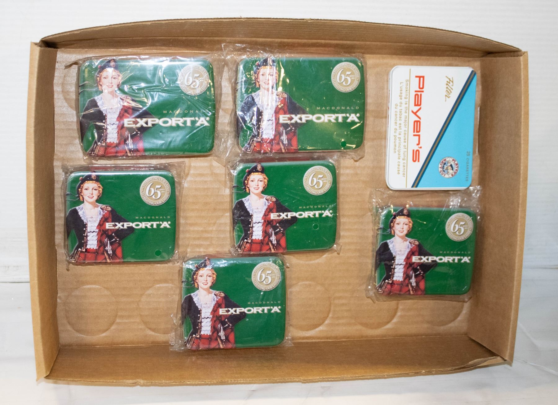 VTG 1990'S, NEW IN PKG/NEVER USED, CELEBRATING OUR LASSIE 65 YR ANNIVERSARY CIGARETTE TIN CASES, TWO-25'S, FOUR-20'S, & 1 PLAYER'S TIN-25'S