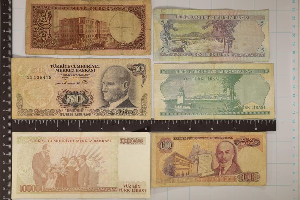 1976 FIVE LIRASI, 1966 TEN LIRASI, 1976 FIFTY LIRASI, 1984 ONE HUNDRED LIRASI AND 1996 ONE HUNDRED THOUSAND LIRASI
