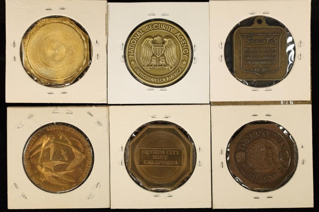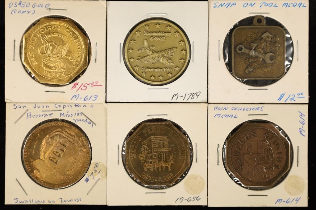 CA. COPY OF $50 GOLD, WELLS FARGO BUILDING NEVADA CITY MINT, SNAP ON TOOL, NATIONAL SECURITY AGENCY OF THE UNITED STATES , FOREIGN COIN COLLECTORS MEDAL AND MISSION SAN JUAN.