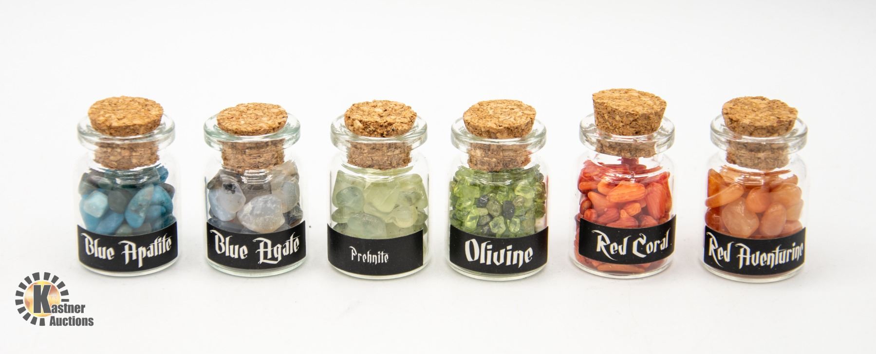 OLIVINE, RED AVENTURINE, BLUE APATITE, RED CORAL, BLUE AGATE WITH CORK LIDS **ALL ITEMS MUST BE REMOVED BY 5PM SATURDAY, APRIL 22ND, 2023. ALL REMAINING ITEMS WILL BE SUBJECT TO A $6.00 PER DAY STORAGE CHARGE. ANY ITEMS REMAINING AFTER MONDAY, MAY 8TH, 2023 WILL BE CONSIDERED FORFEITED. NO REFUNDS WILL BE ISSUED FOR FORFEITED ITEMS.** TO SCHEDULE A PICK UP APPOINTMENT CLICK HERE