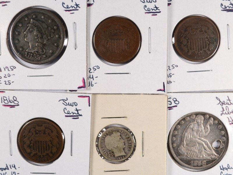(6) MISC COINS (1853-1C, 1864-2C, 1865-2C, 1868-2C, 1914-D-10C, 1858-50C)