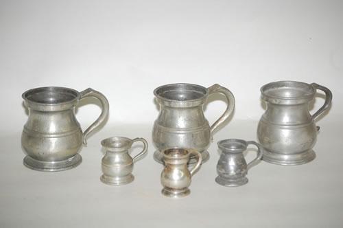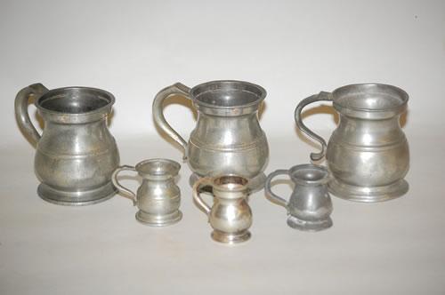 (6) MISC. PEWTER MEASURES - (6) 19TH CENT. ENGLISH BELLIED PEWTER MEASURES-VARIOUS MARKS INCLUDING (3) HALF PINTS & (3) QUARTER GILLS - ONE MONOGRAMMED, WEAR & OLD REPAIRS, IMPERFECTIONS